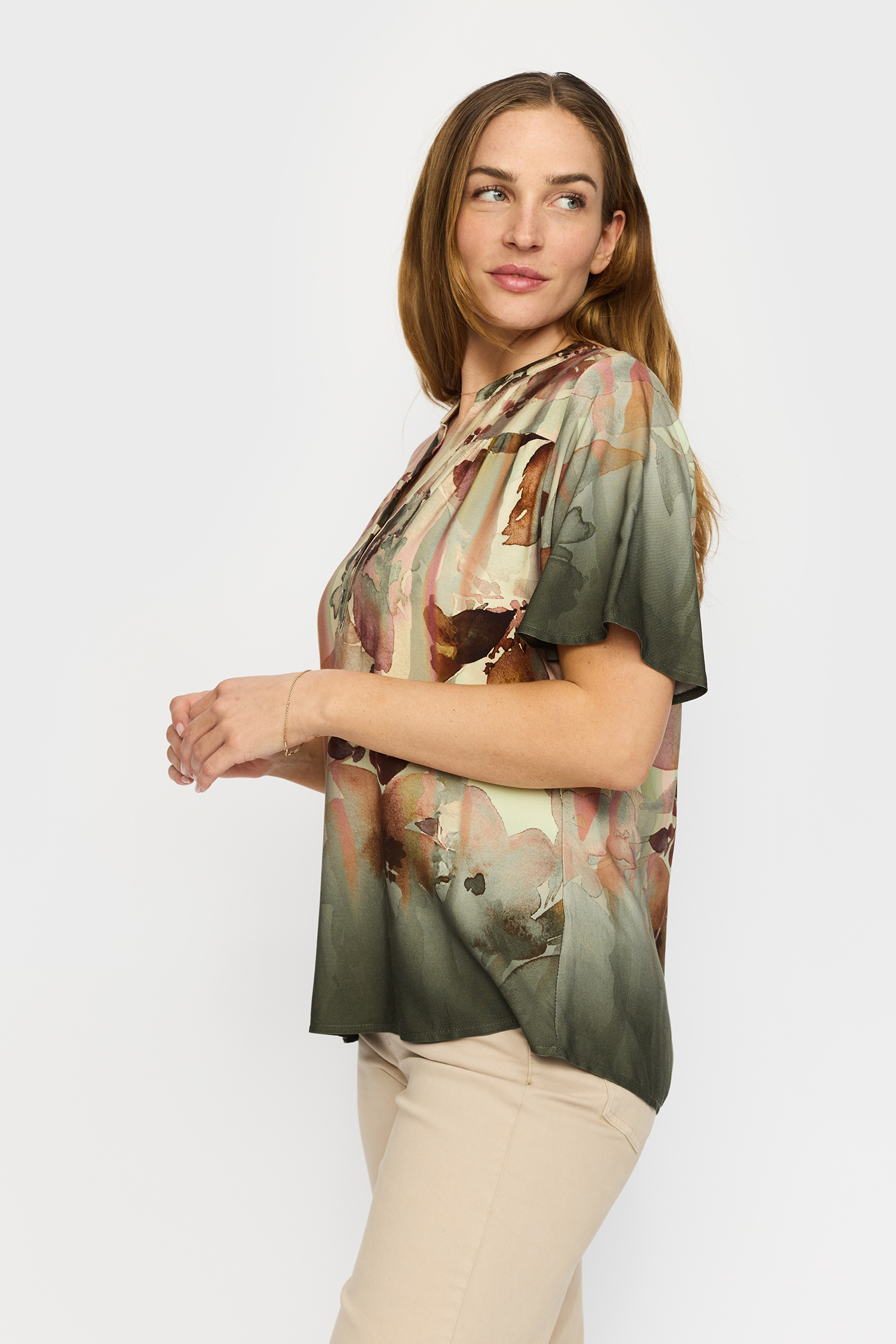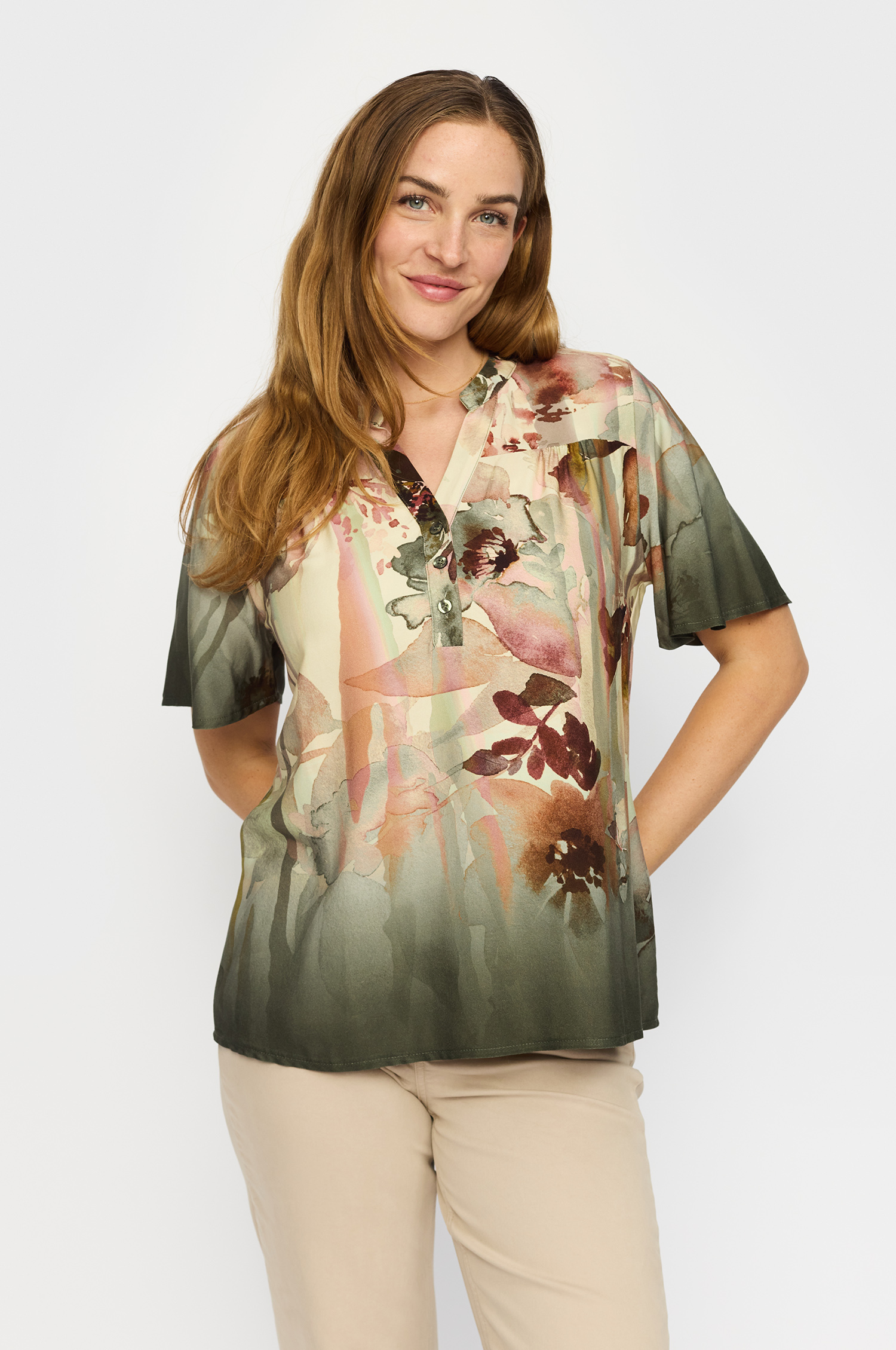Smuk og let bluse med korte brede ærmer og knappelukning.