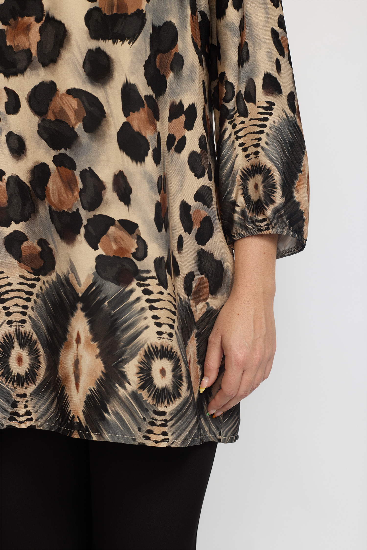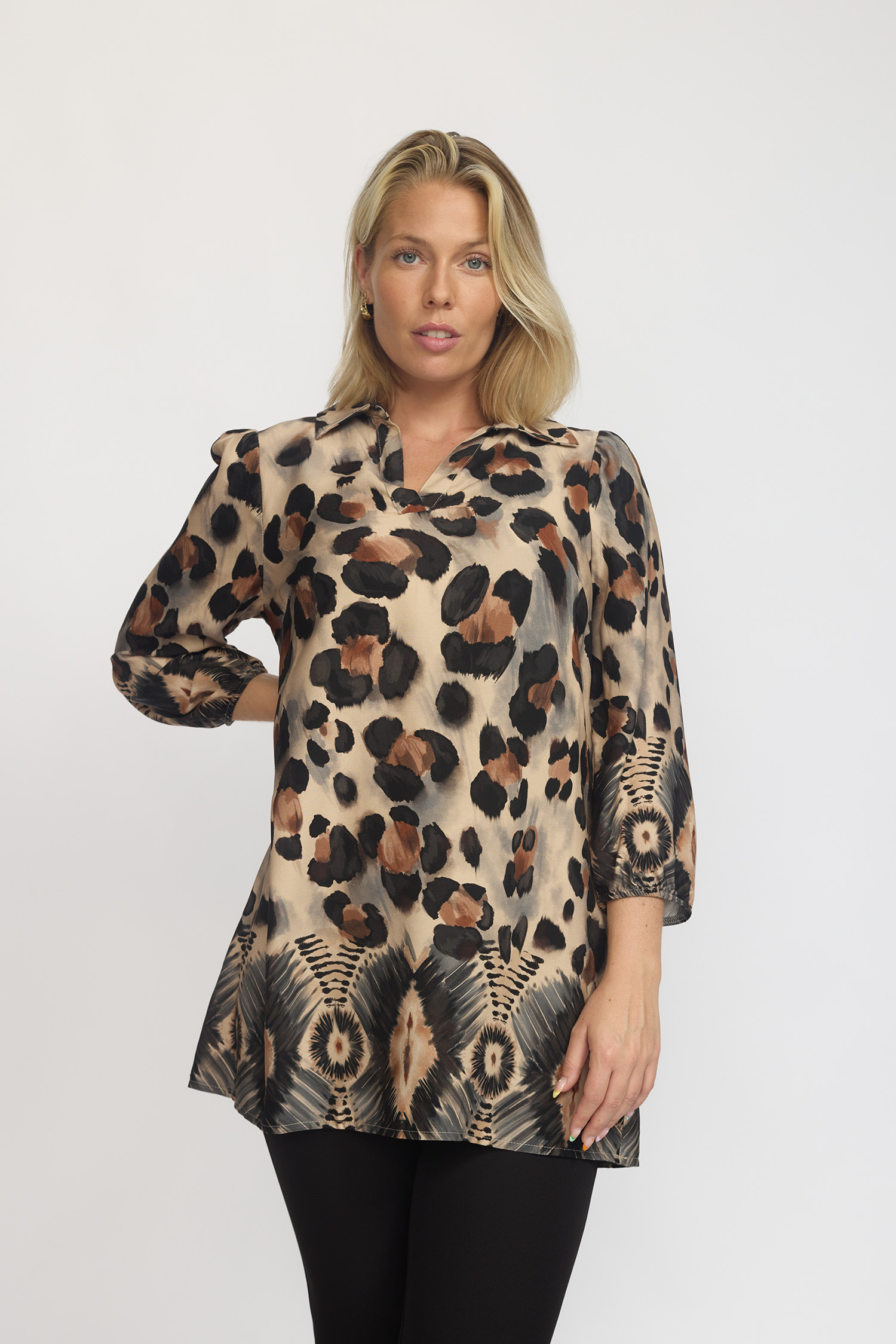 Smuk tunika fra 2-Biz i dyreprint. Tunikaen har en krave, v-udskæring samt 3/4 ærme med elastik i.