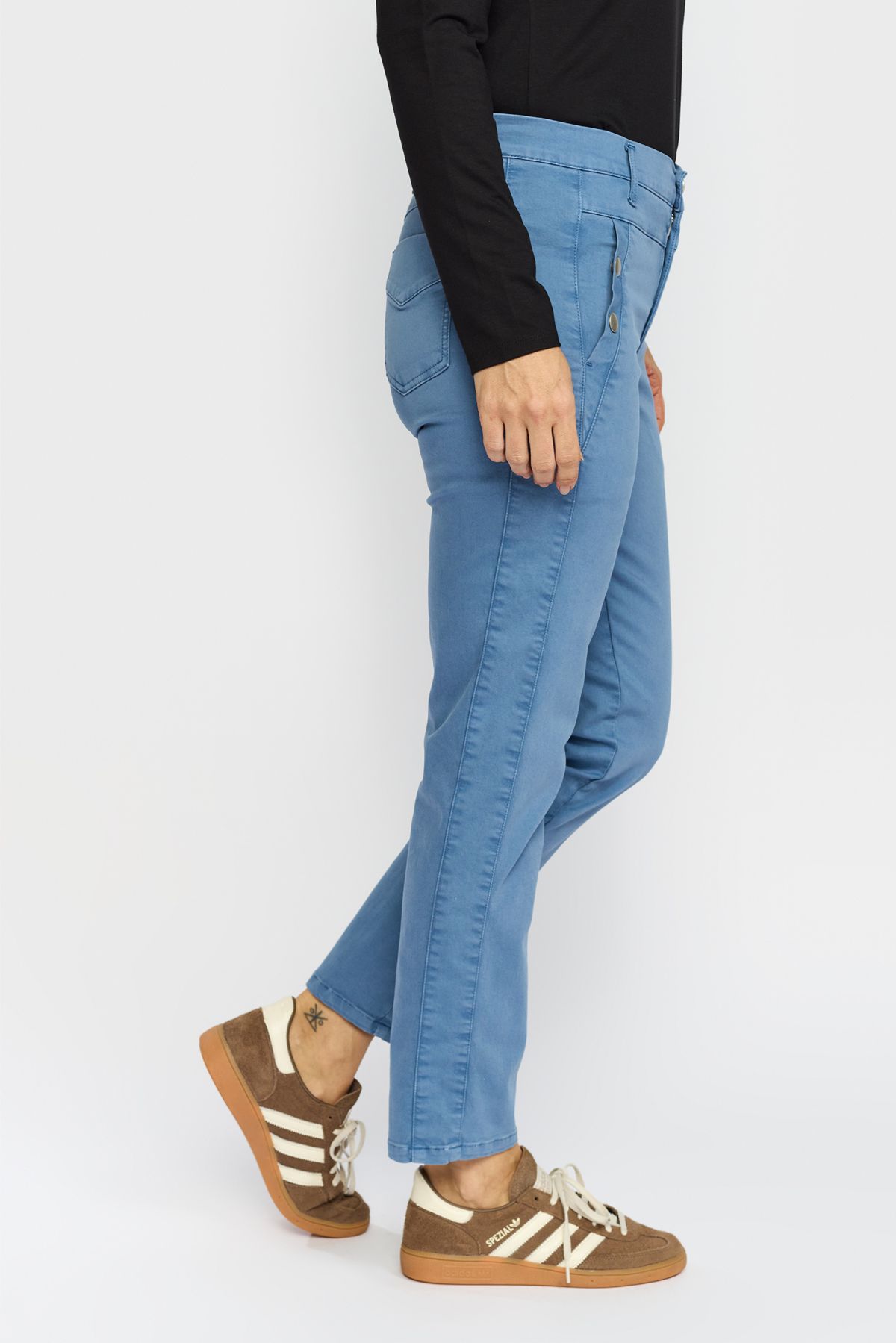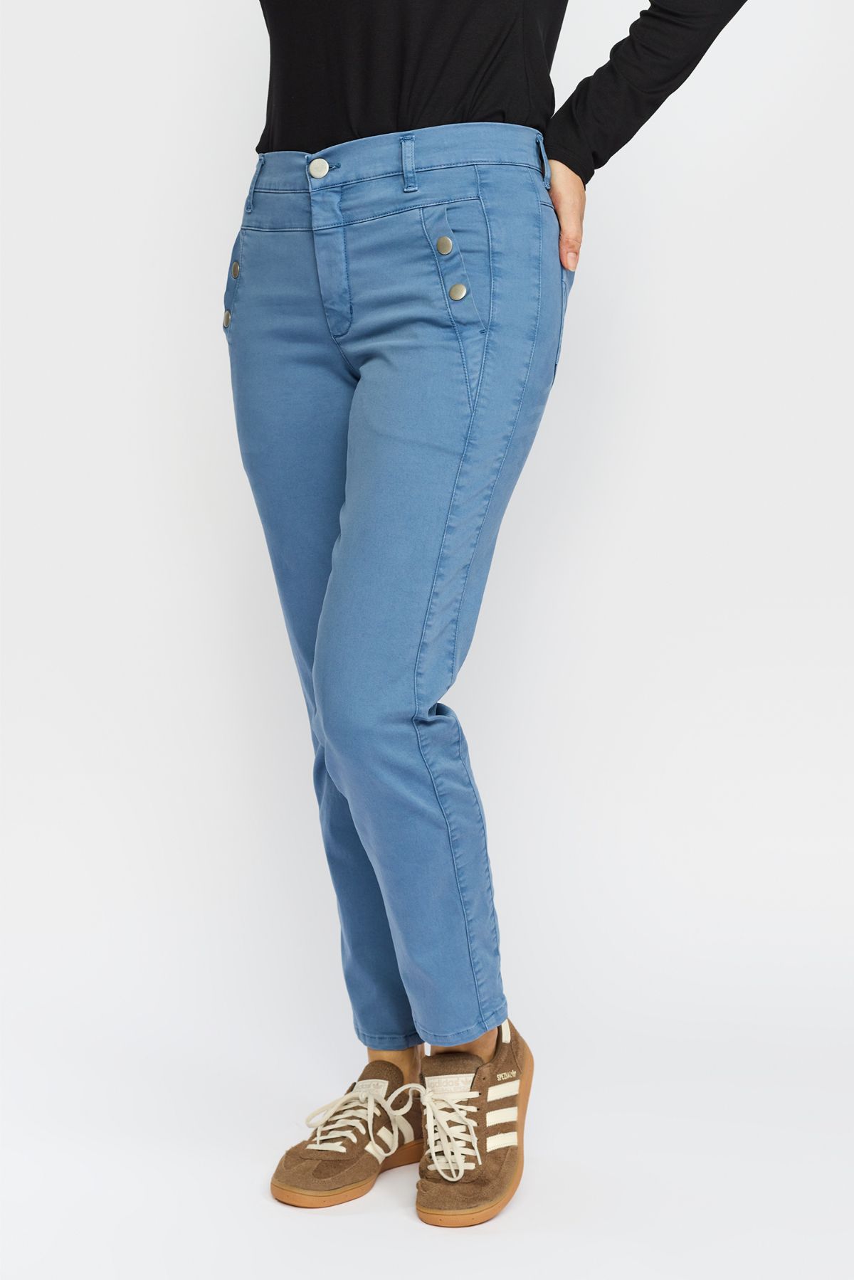 Bestseller bukserne fra 2-Biz i modellen Karcemona. Buksen er designet med en regulær pasform med en høj talje og knappedetaljer ved lommerne og er lavet i en lækker strækbar kvalitet.