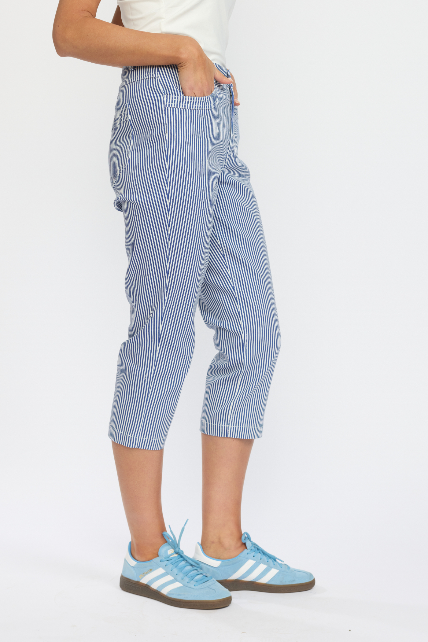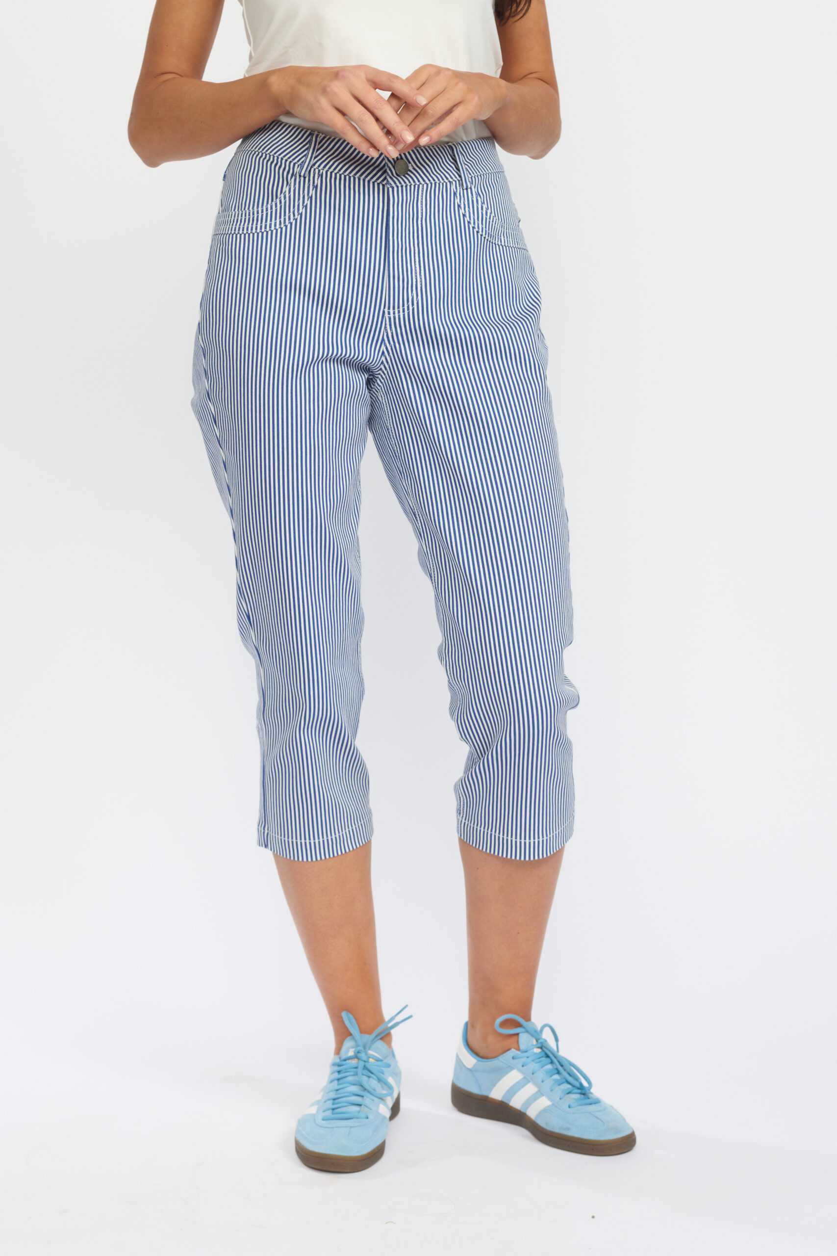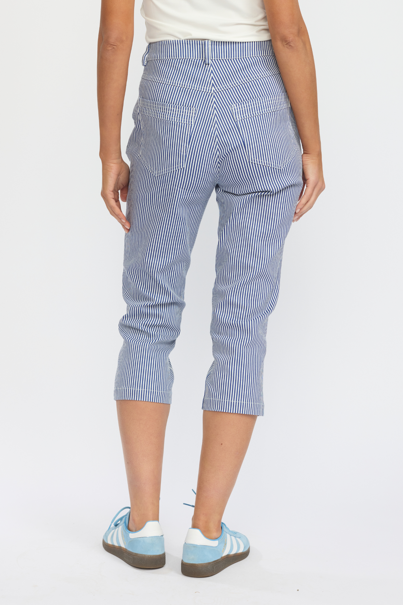 Smart mælkedrengsstribet capri buks fra 2-Biz. Buksen lukkes med knap og lynlås, og har lommer foran og bagpå.