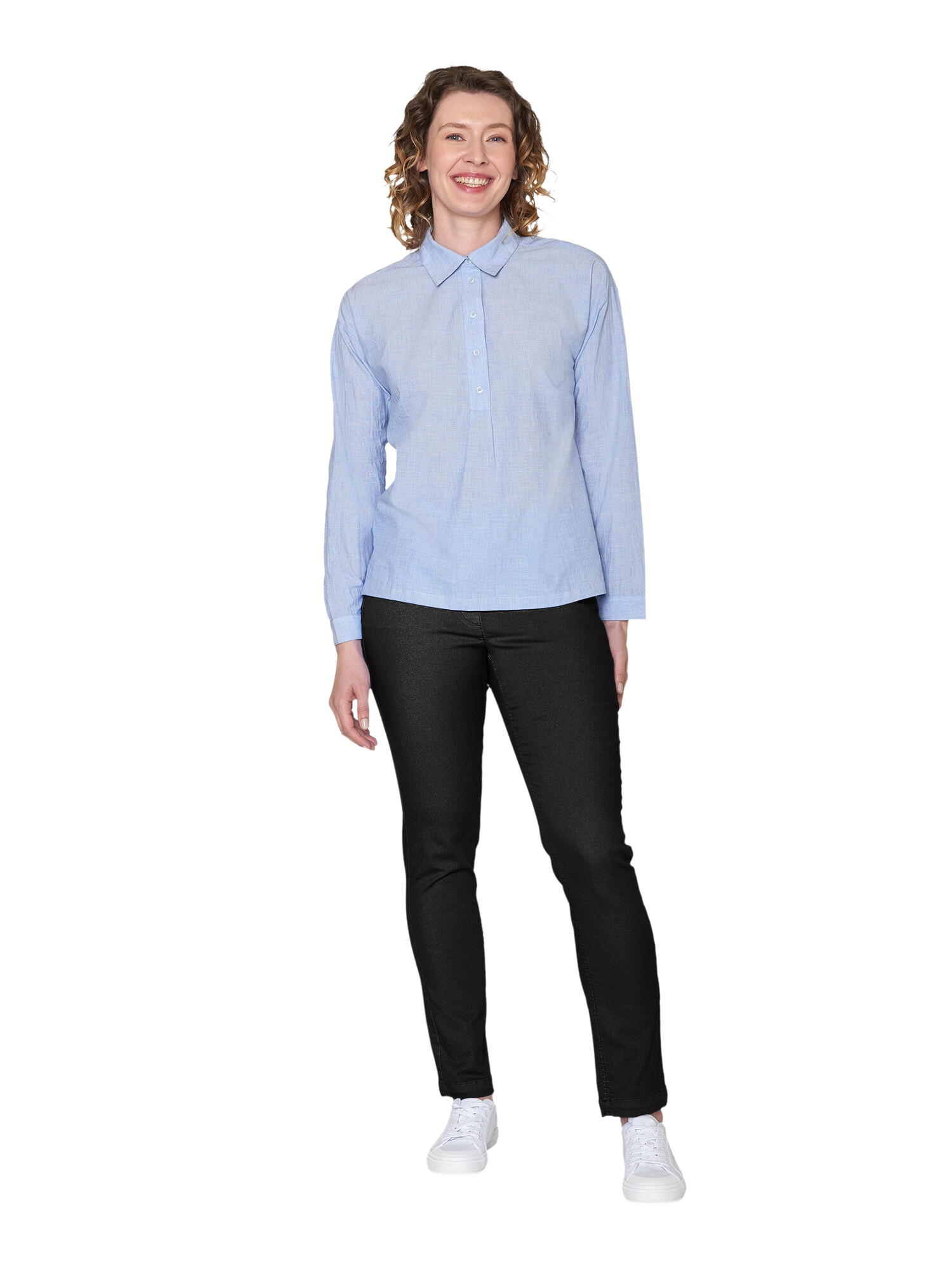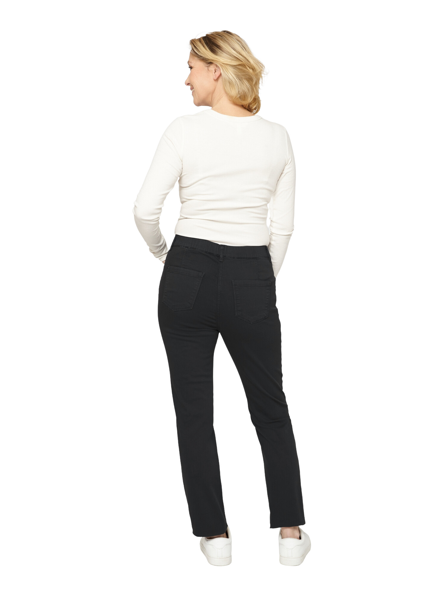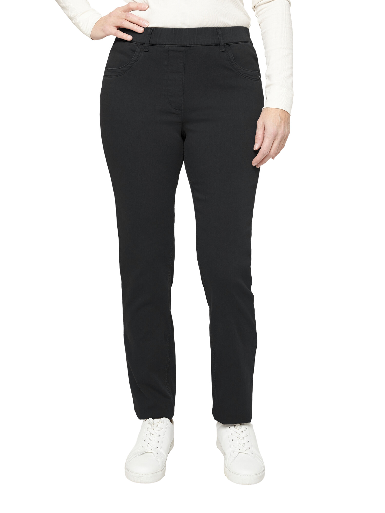 Bukser i bomuld, polyester og elasthan i modellen Madelaine fra Brandtex. Det er en 4 lommet model med fast elastik i taljen og bæltestropper. Der er syet en ekstra stikning langs lommekanten som en lille detalje. En super behageligt buks som kan styles sammen med bluser og jakker eller som leggins under en smart tunika.