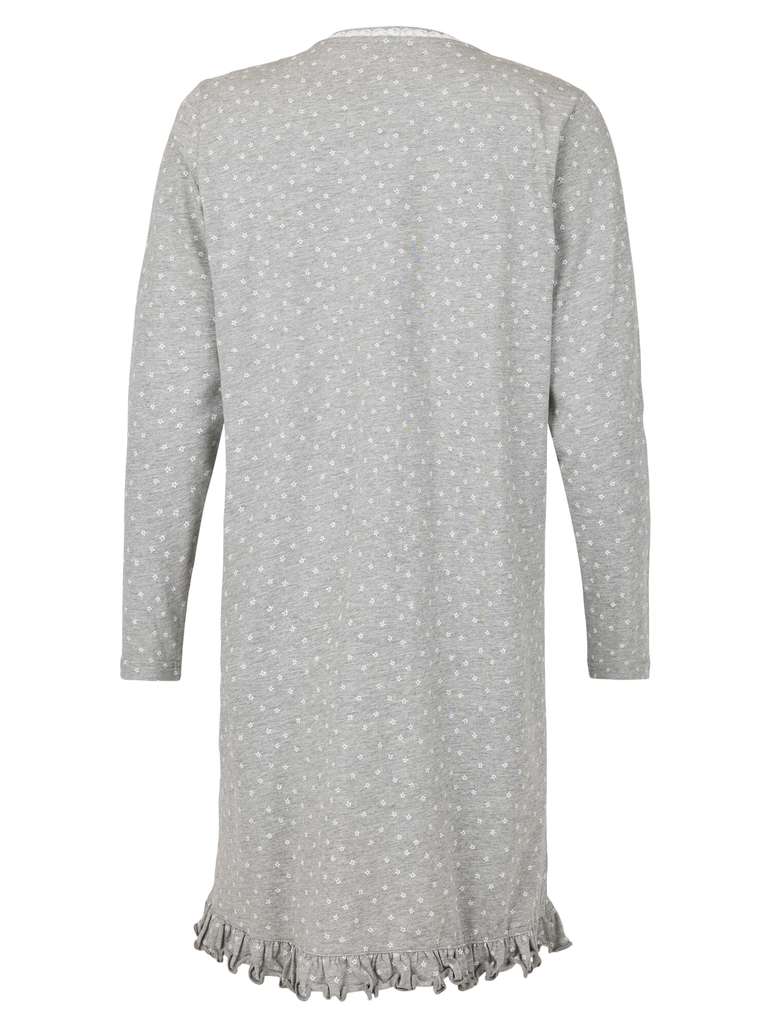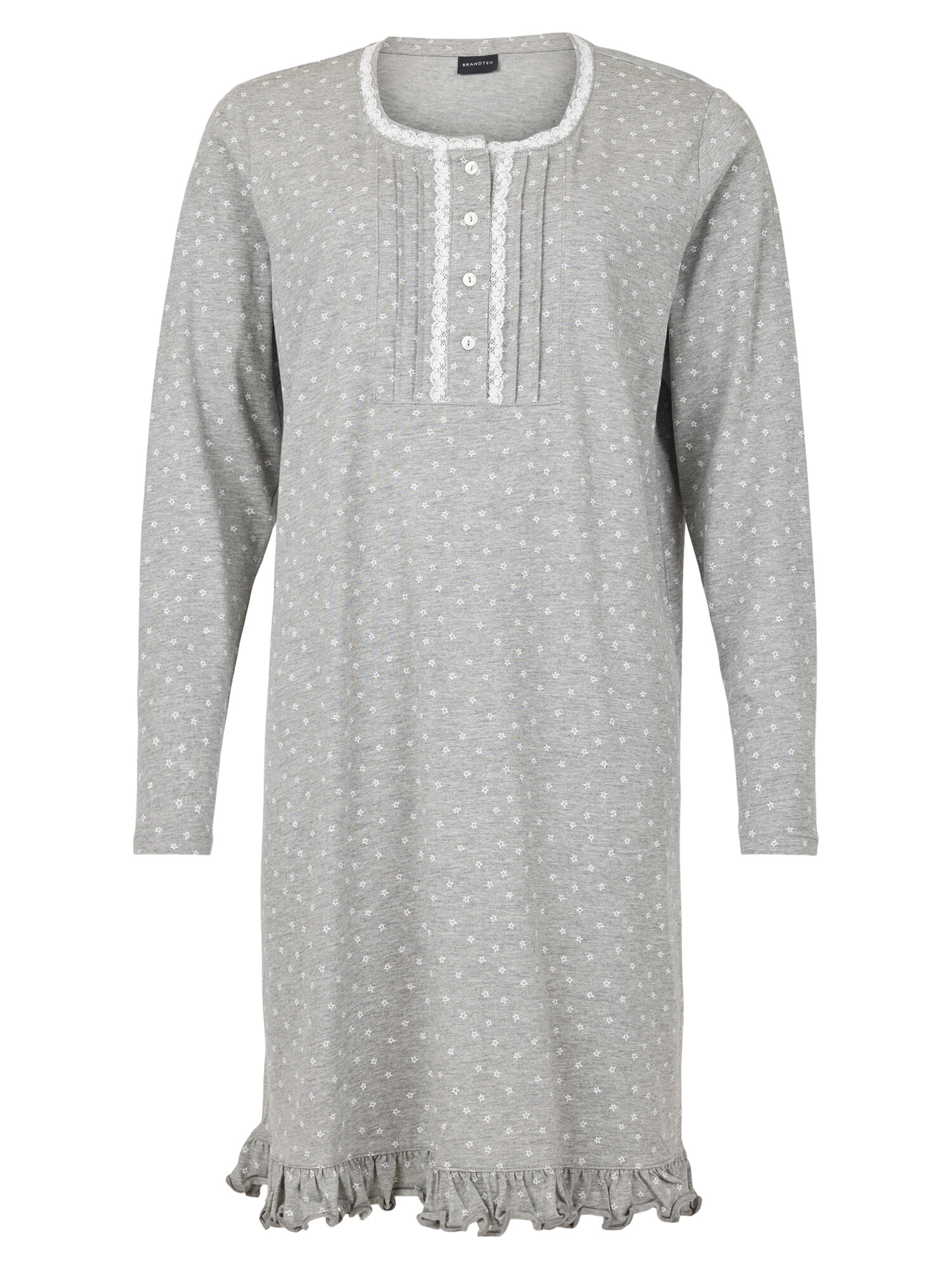 Sød natkjole med stjerner i printet fra Brandtex. Kjolen har et langt ærme, Rund hals, en lille stolpelukning og en lille flæse forneden.