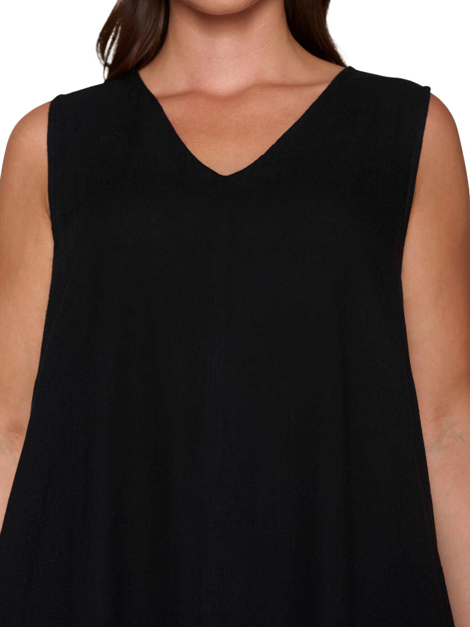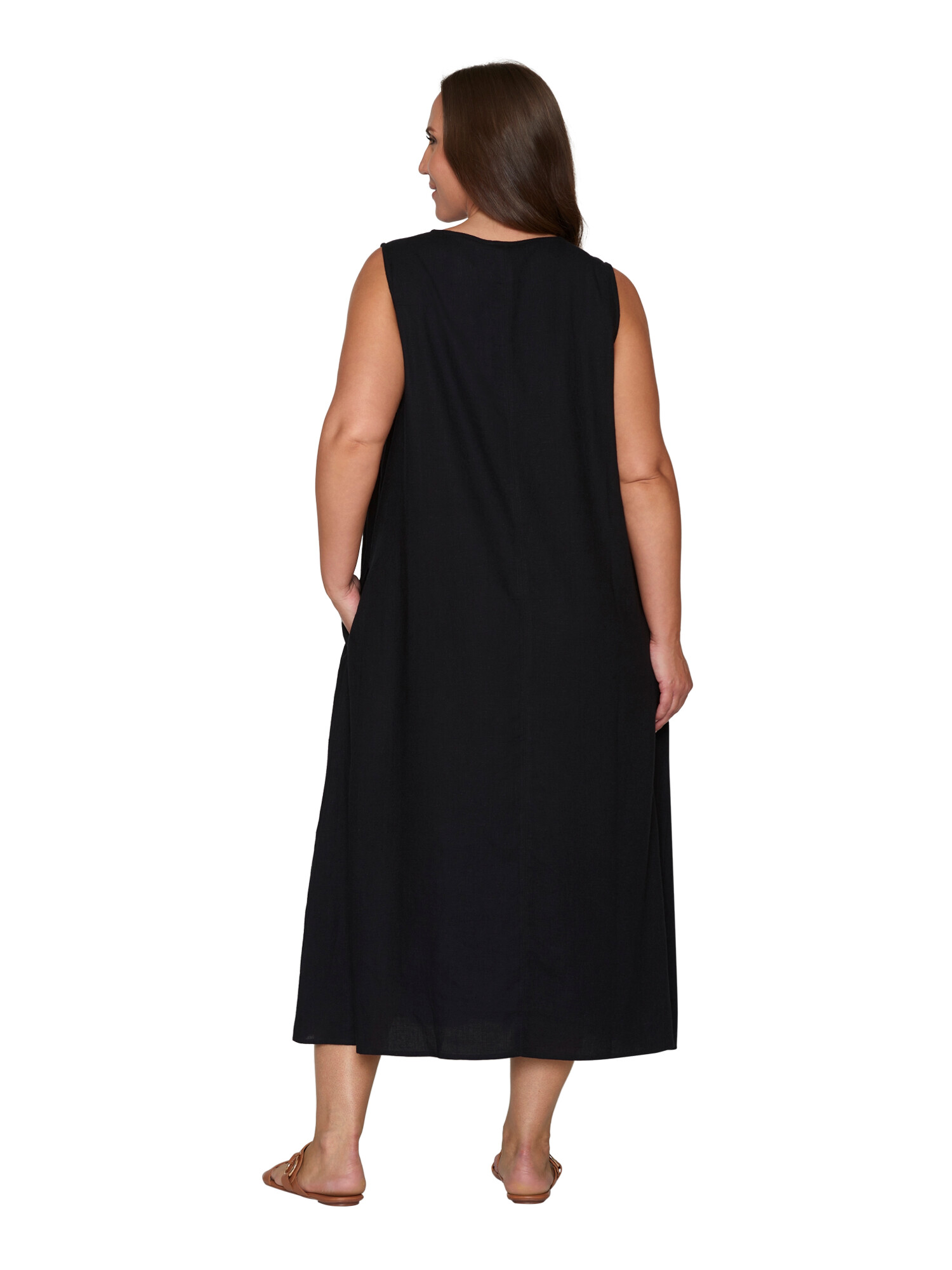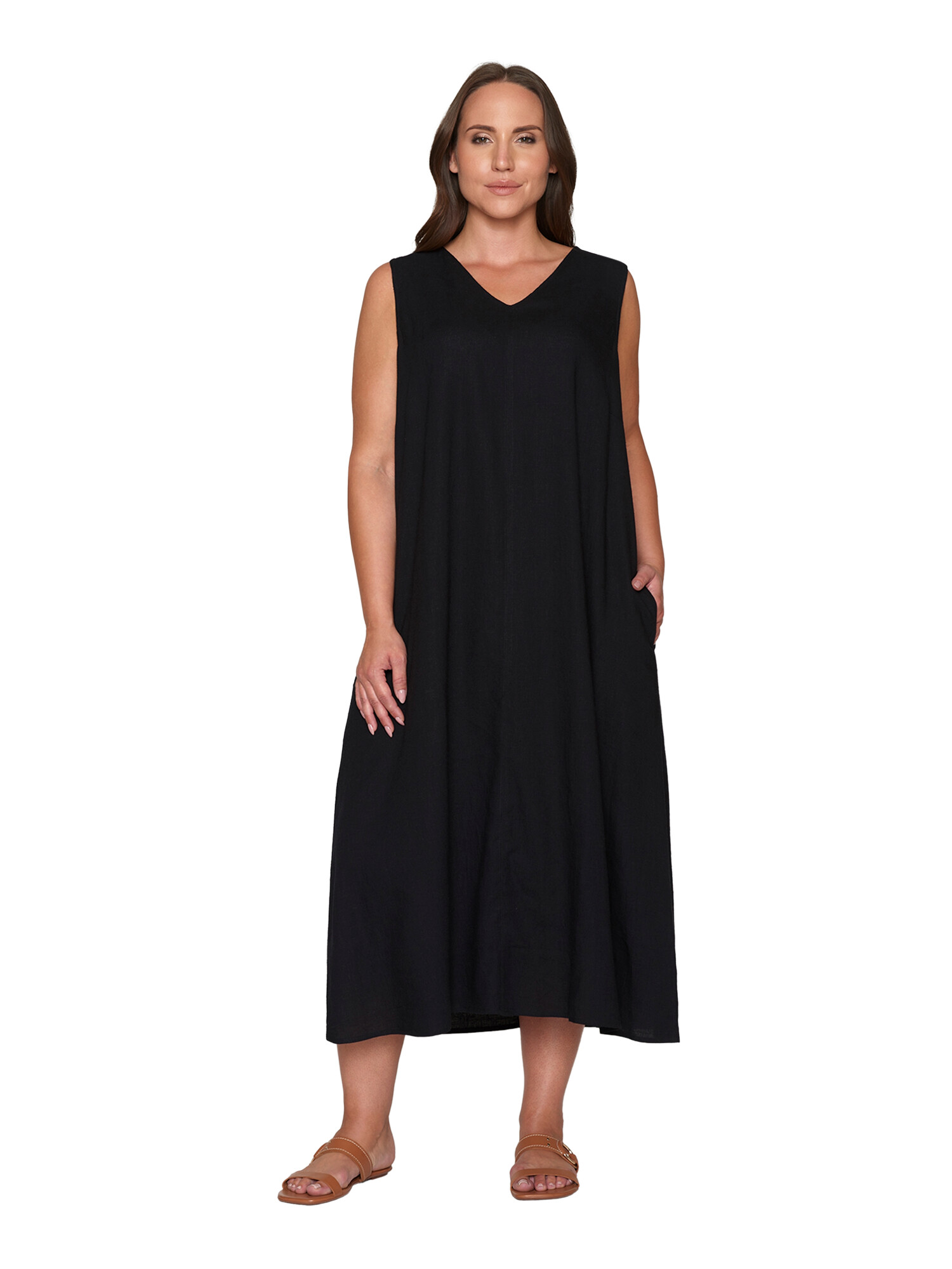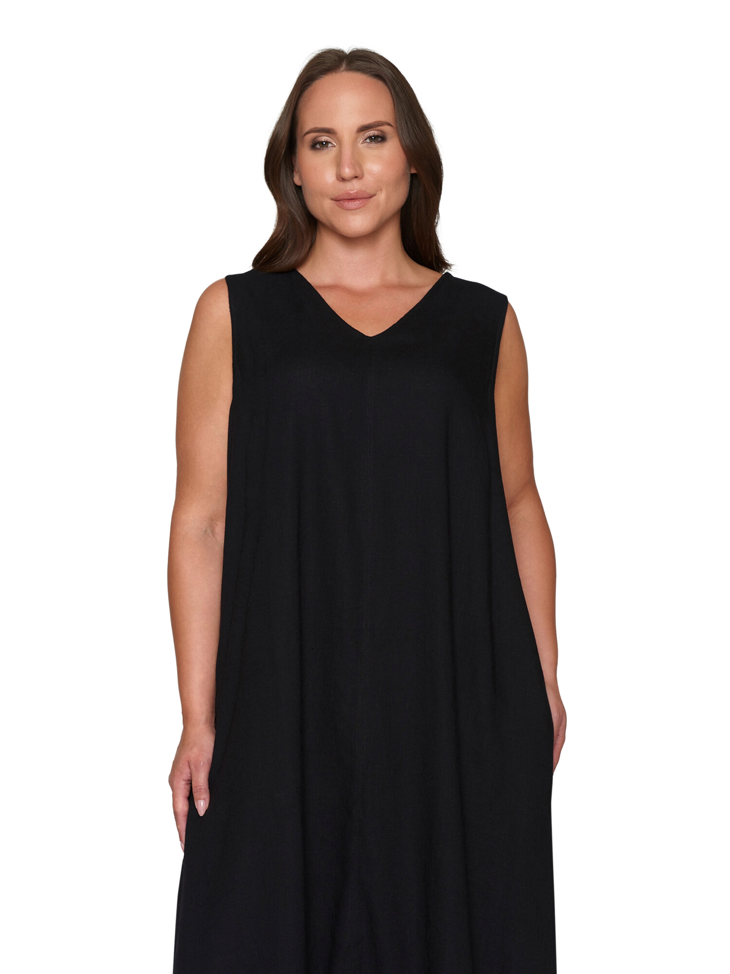Lækker kjole i hør / viskose blanding fra Ciso. Kjolen er lang, har v-udskæring, lommer og brede stropper.