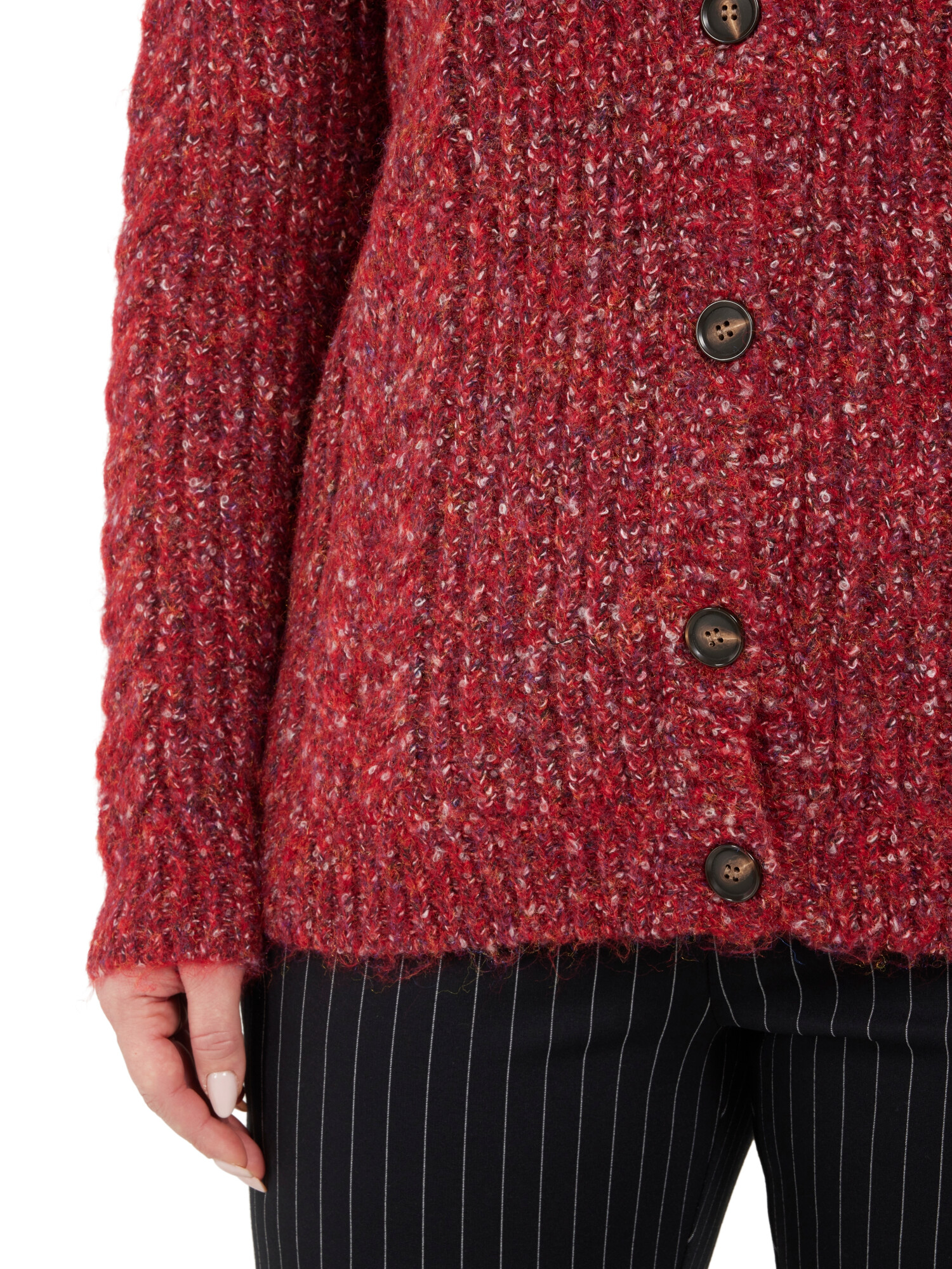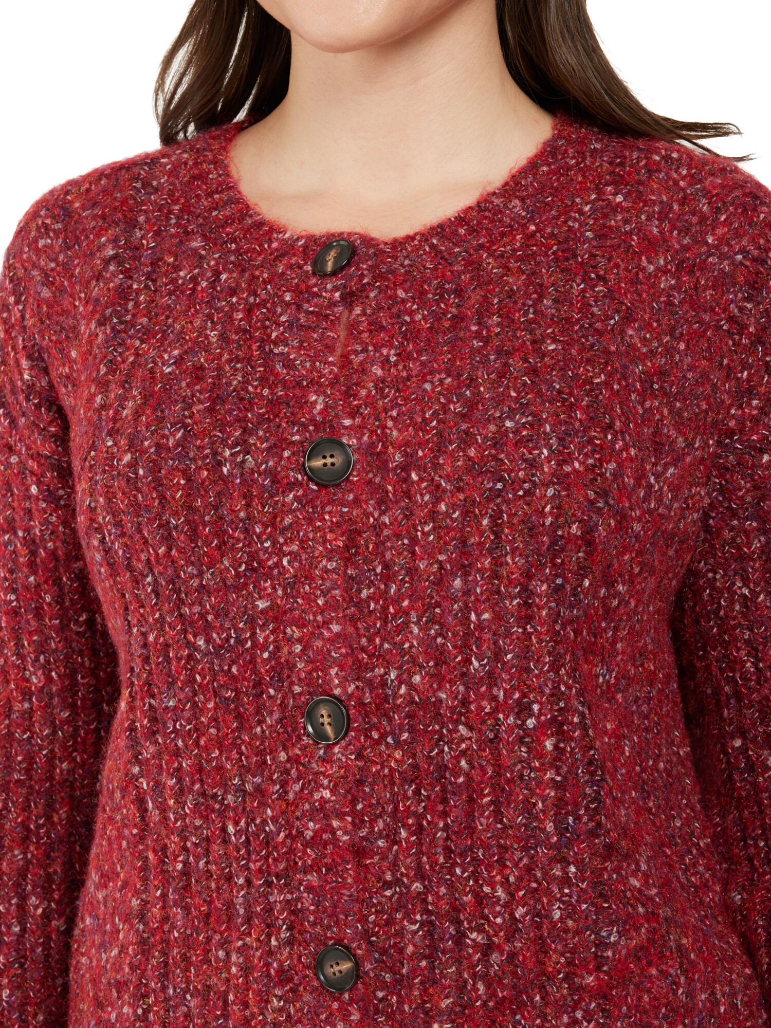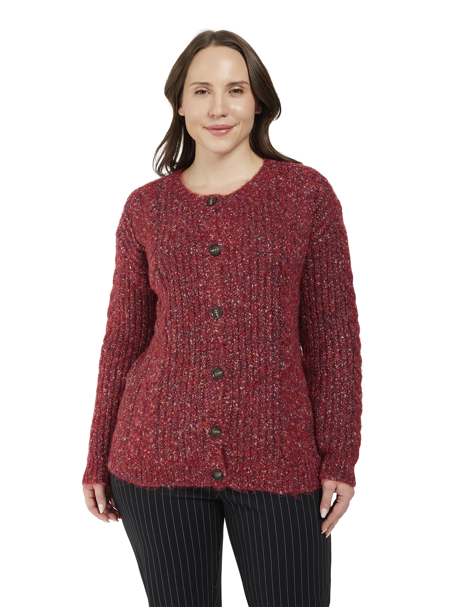 Super pæn og lun cardigan fra Ciso i meleret strik og med rund hals. Cardiganen bliver lukket med knapper.