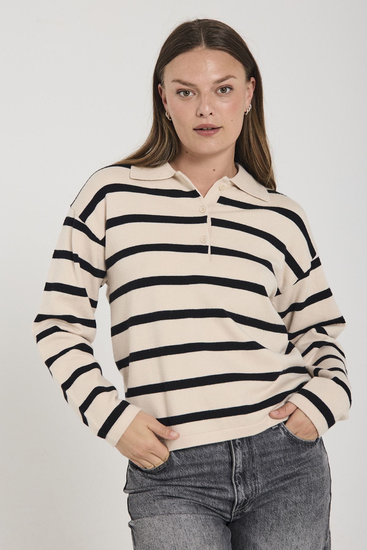 Super lækker Pullover fra FreeQuent i modellen Claura. Pulloveren er lavet i en blød finstrikket kvalitet og i en enkel model i en løs pasform. Pulloveren har lange ærmer, kontrastriber, en fin krave samt en lille stolpelukning.