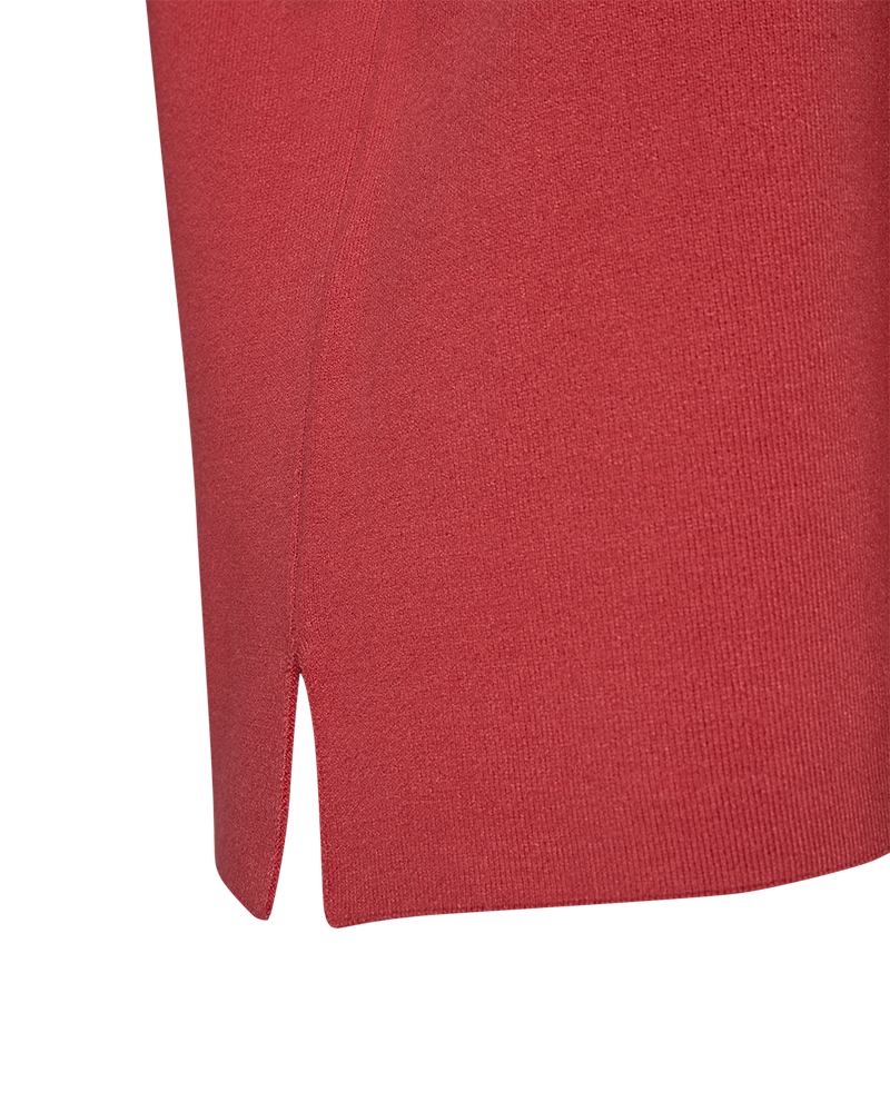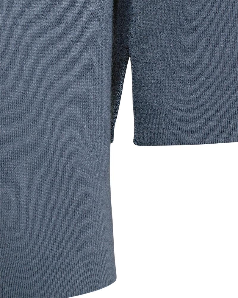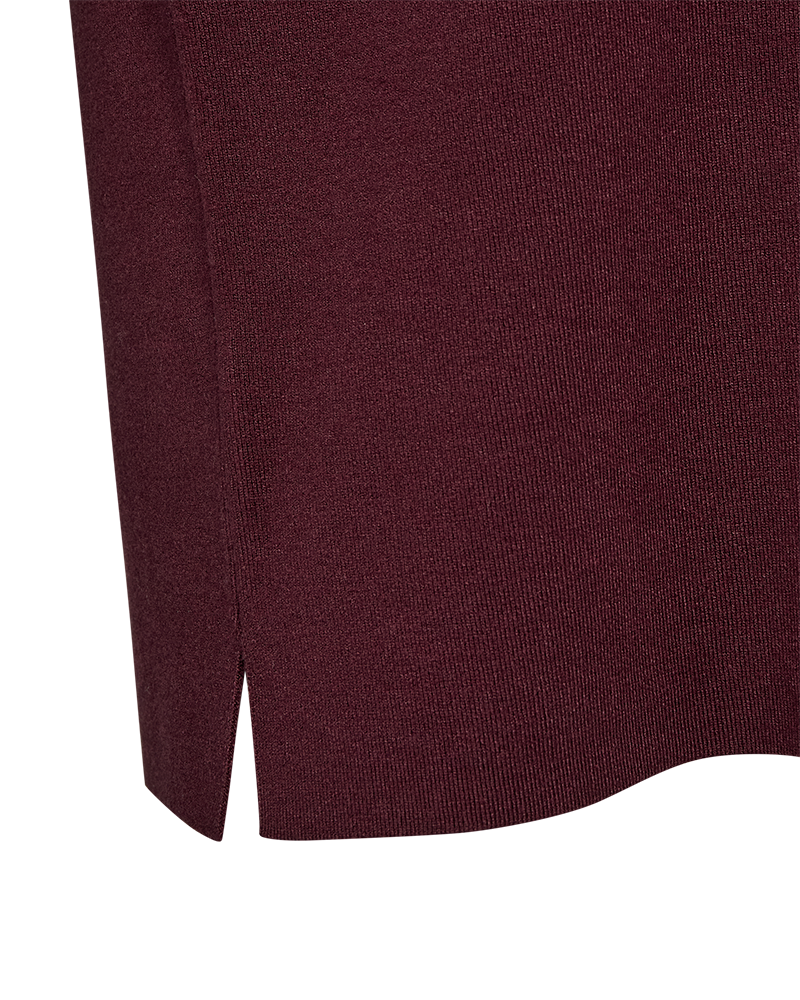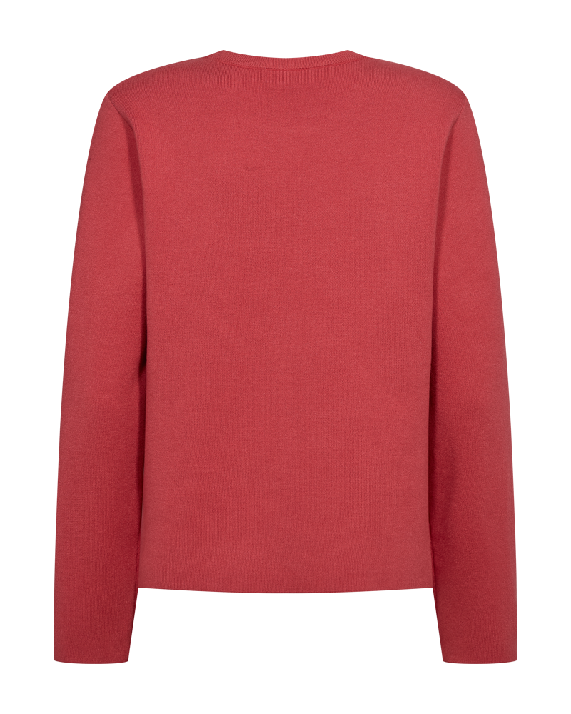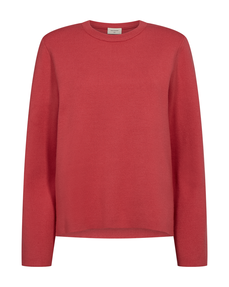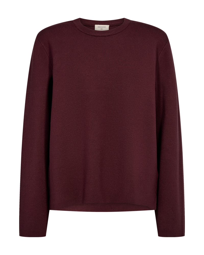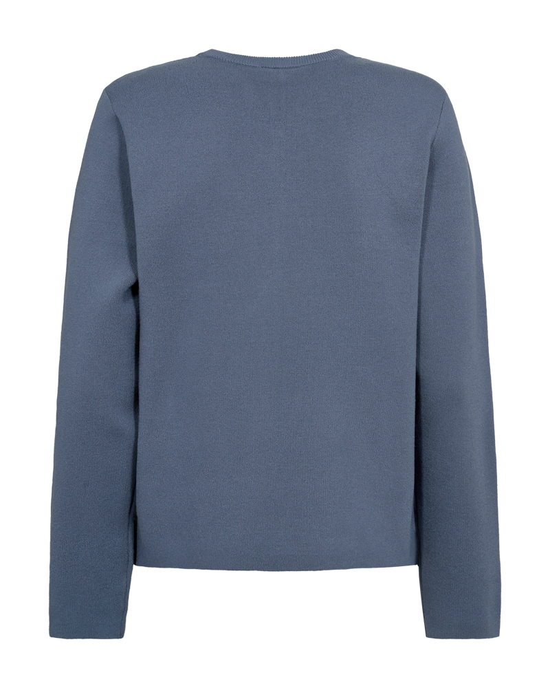 Pulloveren er i en finstrikket kvalitet, har lange ærmer, rib i den runde halsudskæring samt slids i siderne.