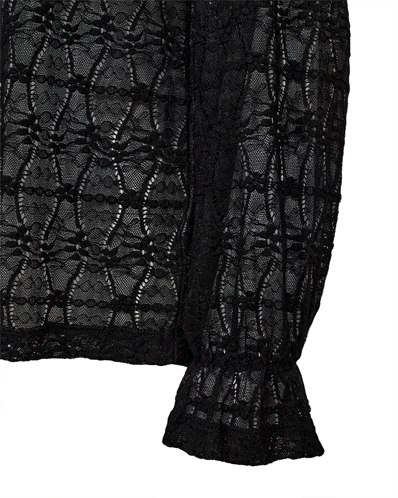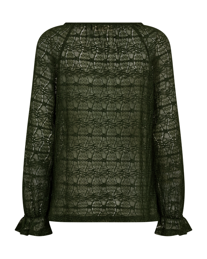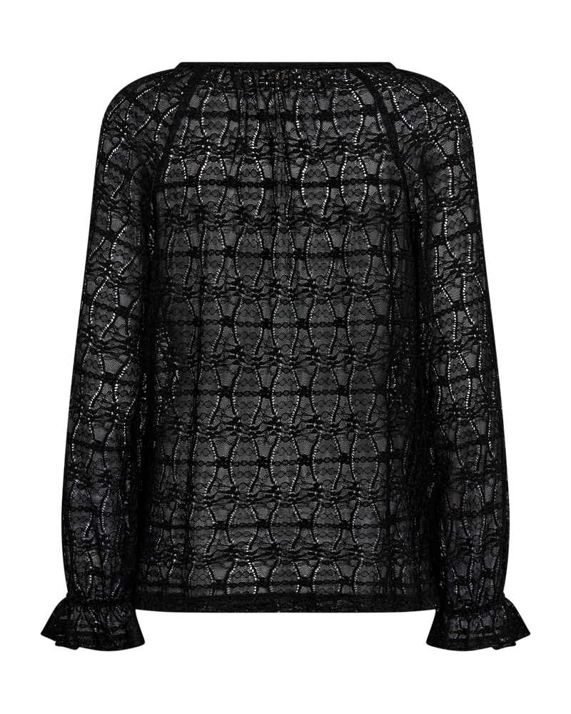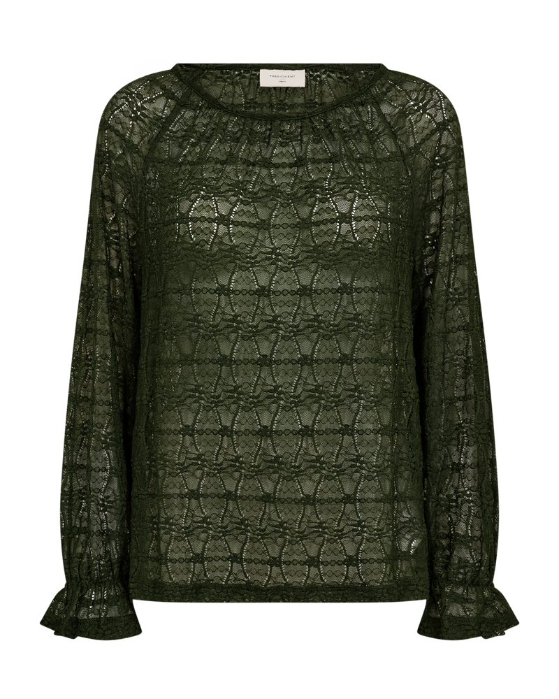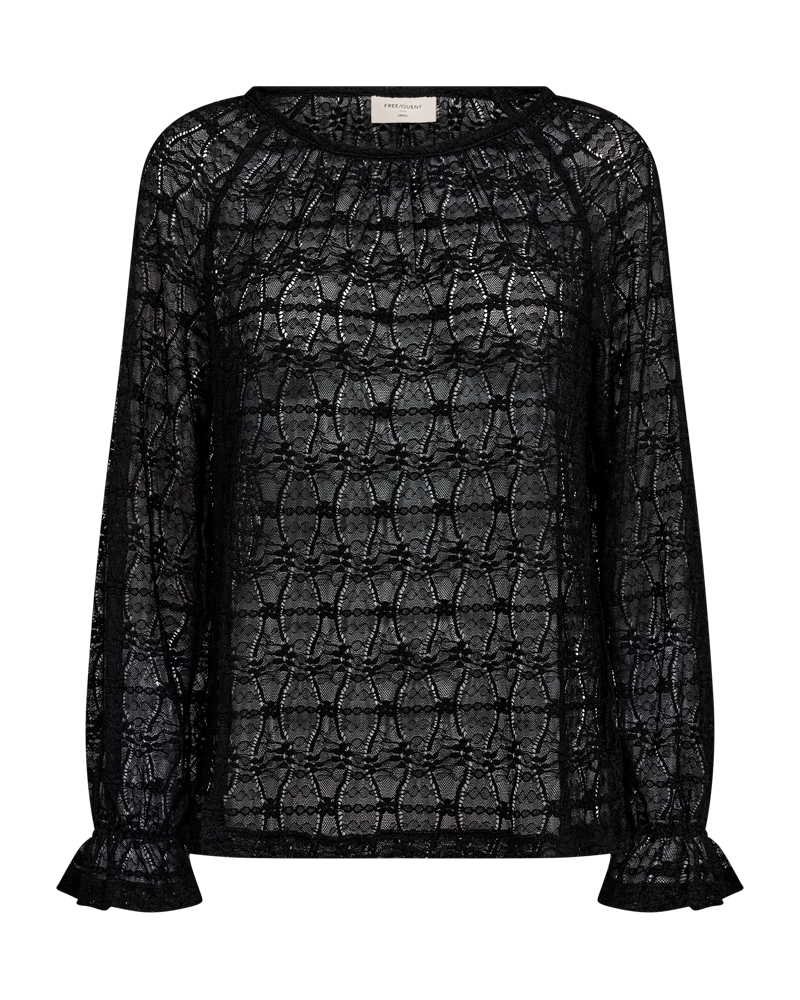 Blusen har lange ballonærmer med elastik og flæse cuff, en regulær pasform samt en rund halsudskæring.