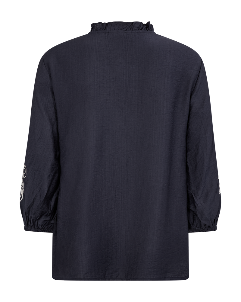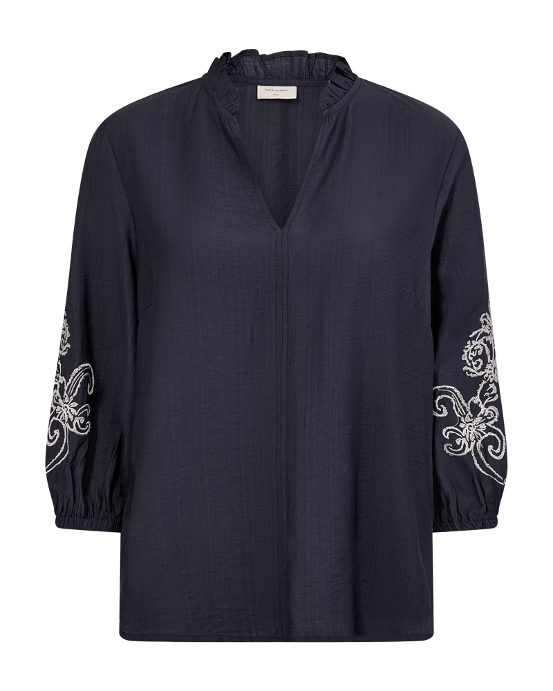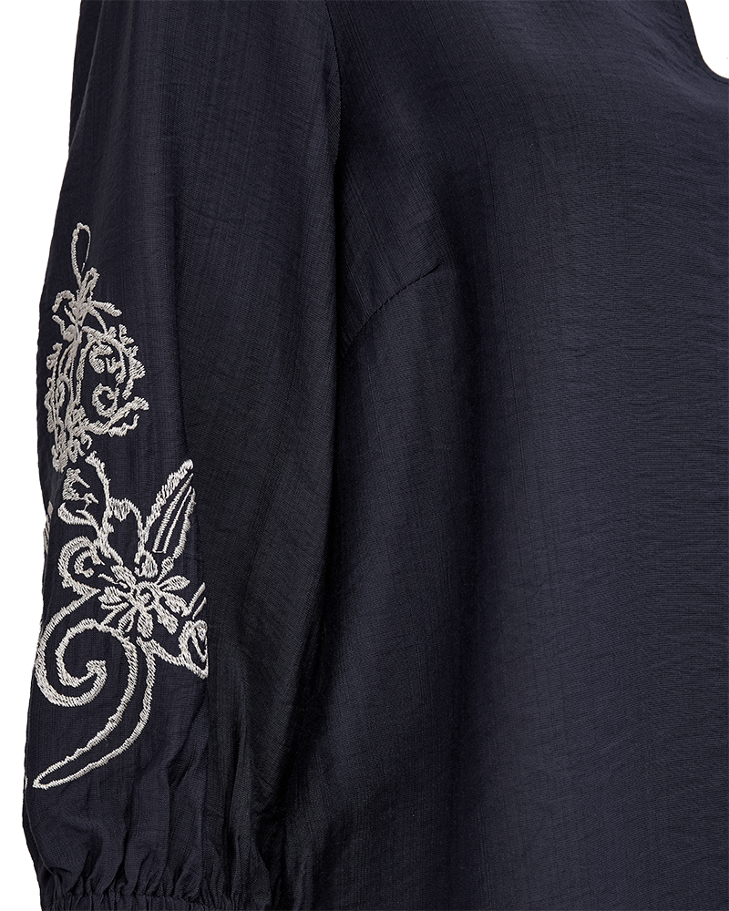 Blusen har 3/4 ærme med en elastikkant som afslutning samt broderi.
