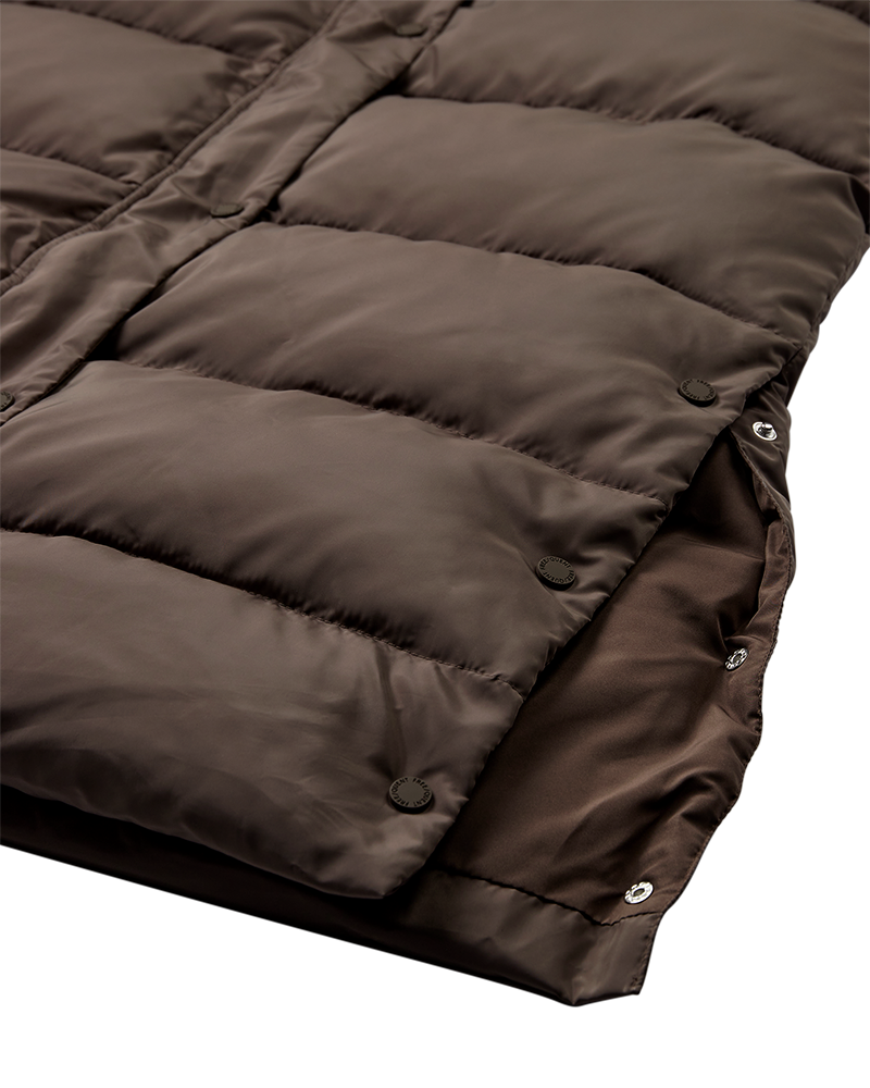 Jakken er lang, har 2 vejs lynlås- trykknapslukning, sidelommer med en knap der lukker lommen på midten, hætte samt slidser i siderne der kan åbnes/lukkes med knapper.