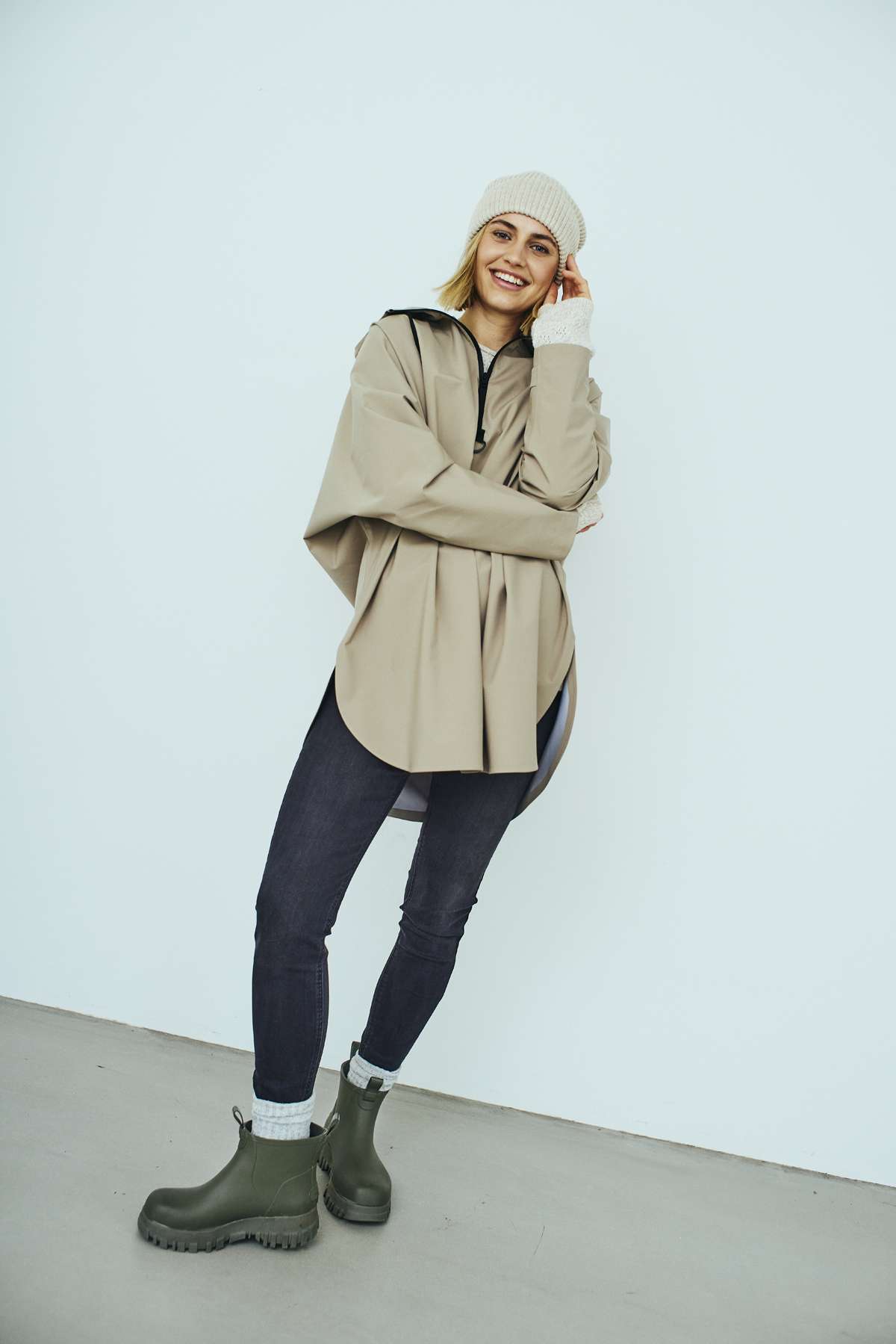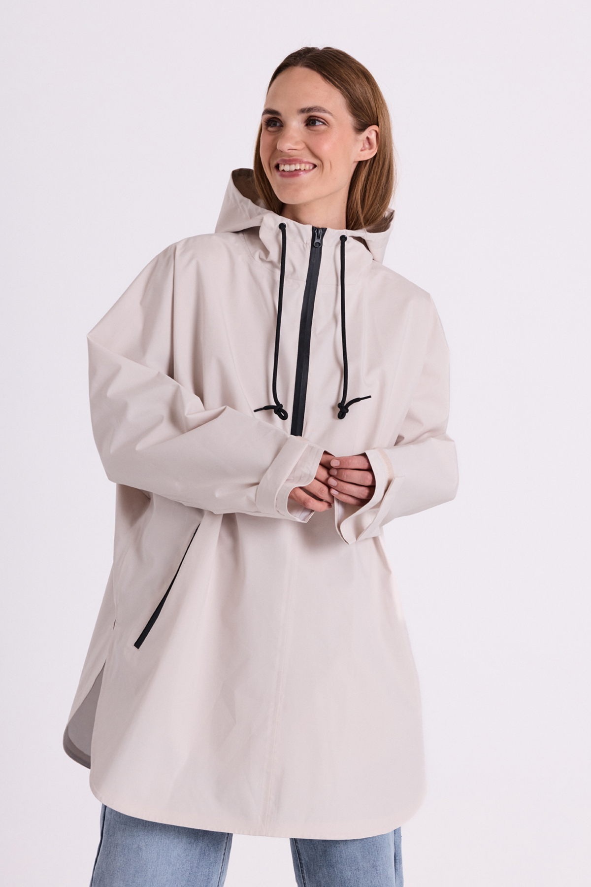 Ponchoen er en enkel i modellen med velcrorem i de lange ærmer, snøre i hætten, sidelommer samt lynlåslukning med tapede sømme og D-ring.