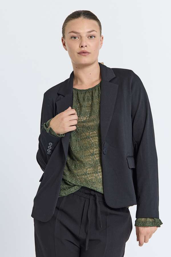 Lækker kort jakke fra FreeQuent i den populære Nanni structure serie. Jakken er lavet i en blød og stretchy kvalitet, har lange ærmer og kan lukke med en enkelt knap. Jakken har også en v-udskæring med revers og sidelommer.