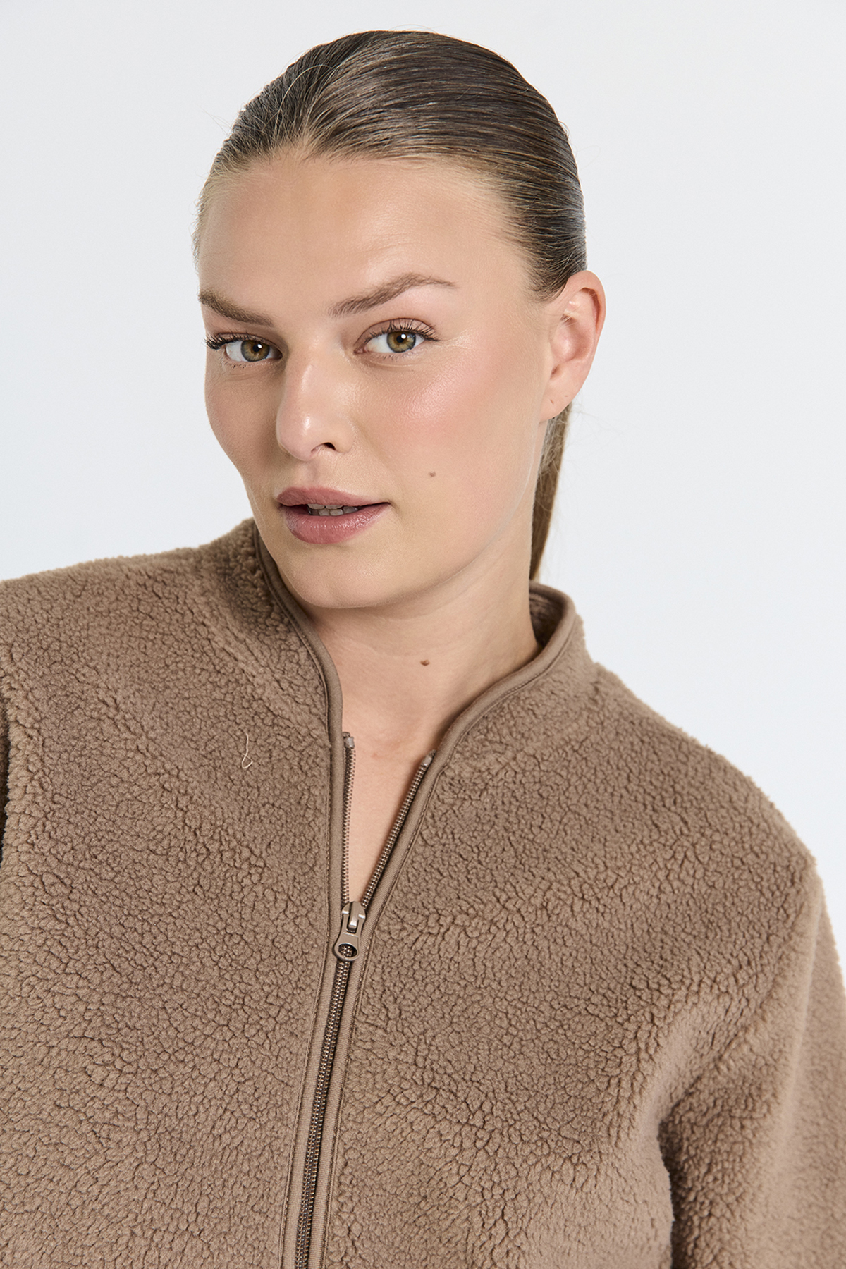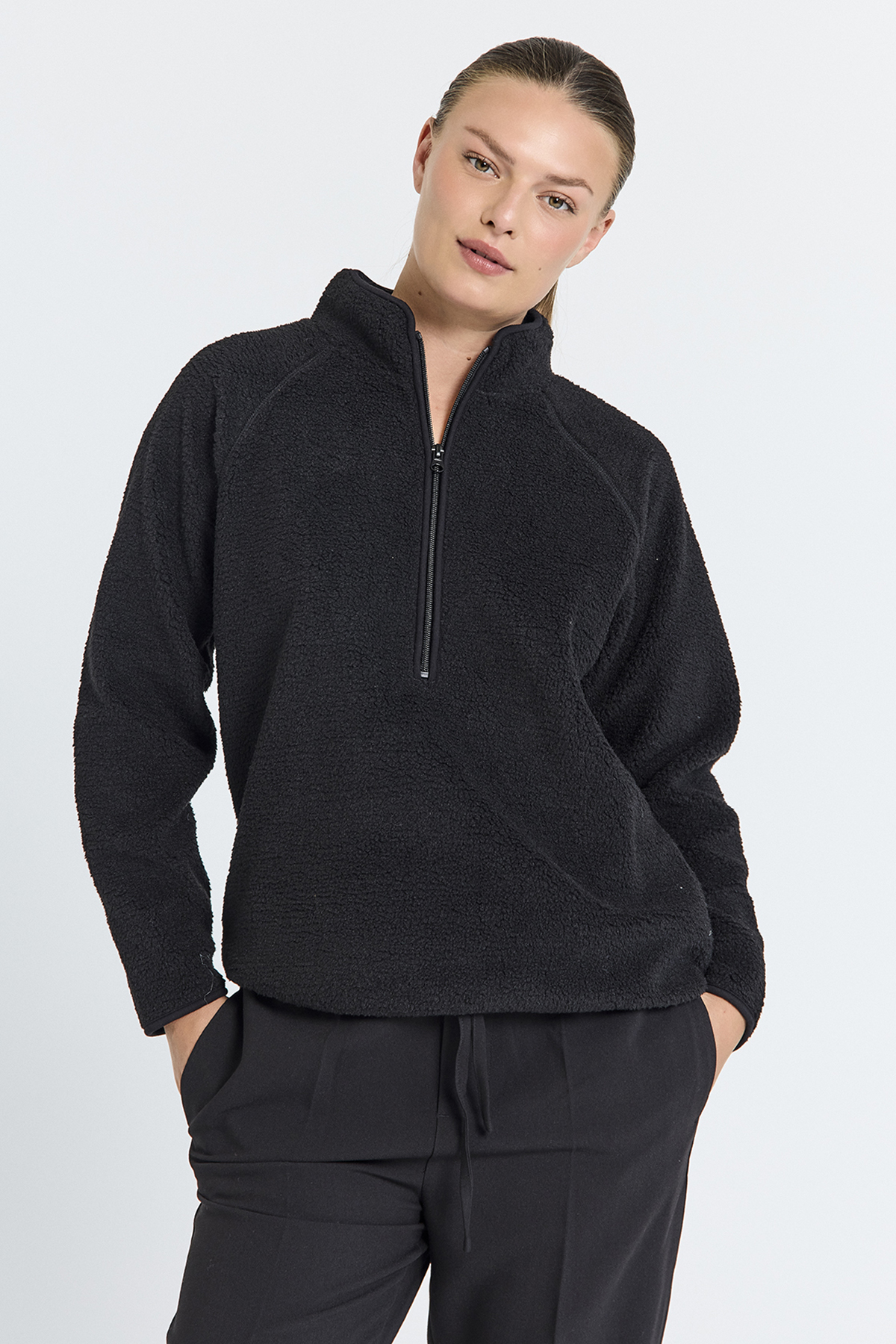 Pullover fra FreeQuent i en blød teddybear kvalitet. Pulloveren er helt enkel i modellen og har lynlåslukning, kravekant, lange raglanærmer og en elastikkant i bunden.