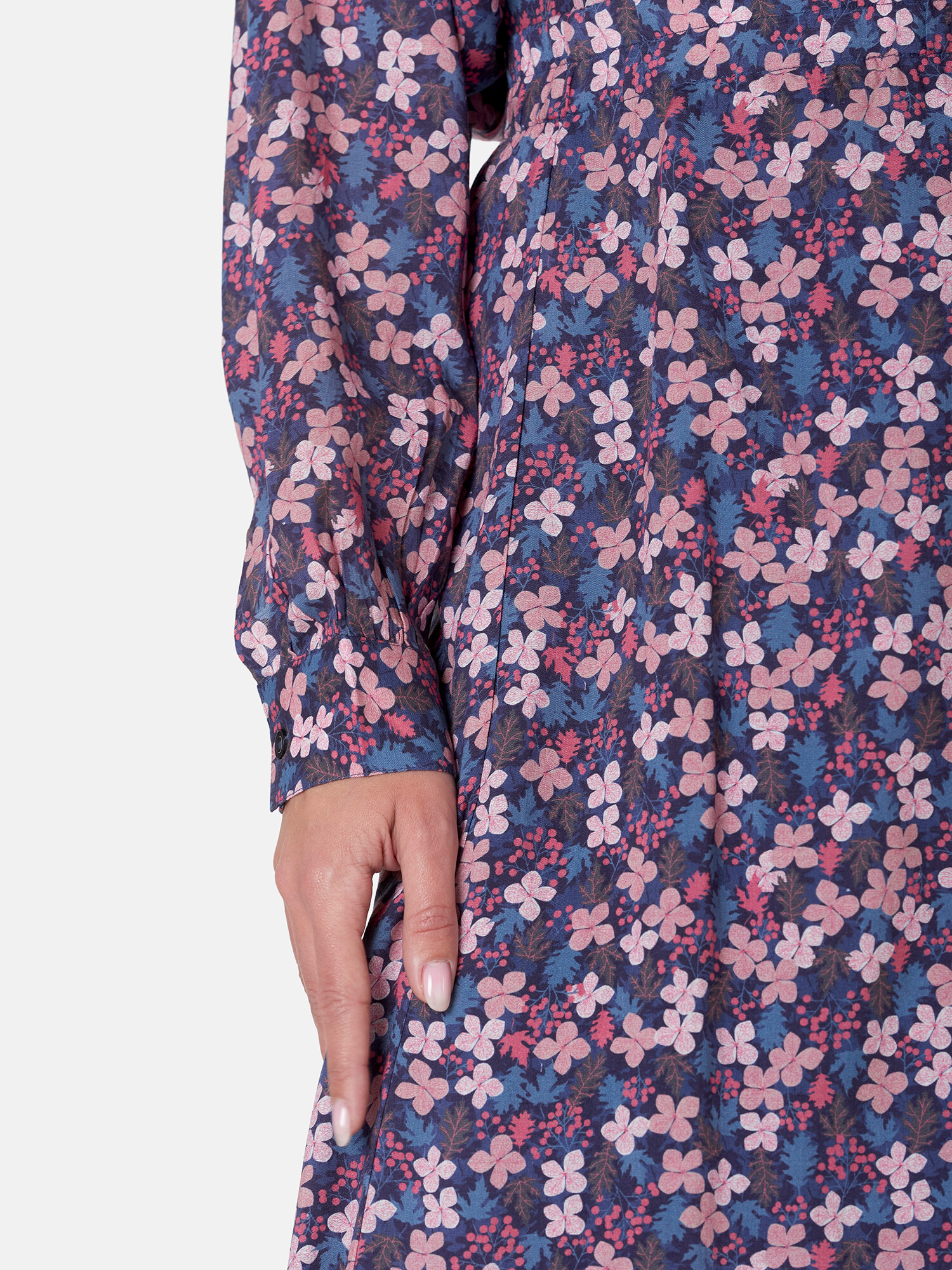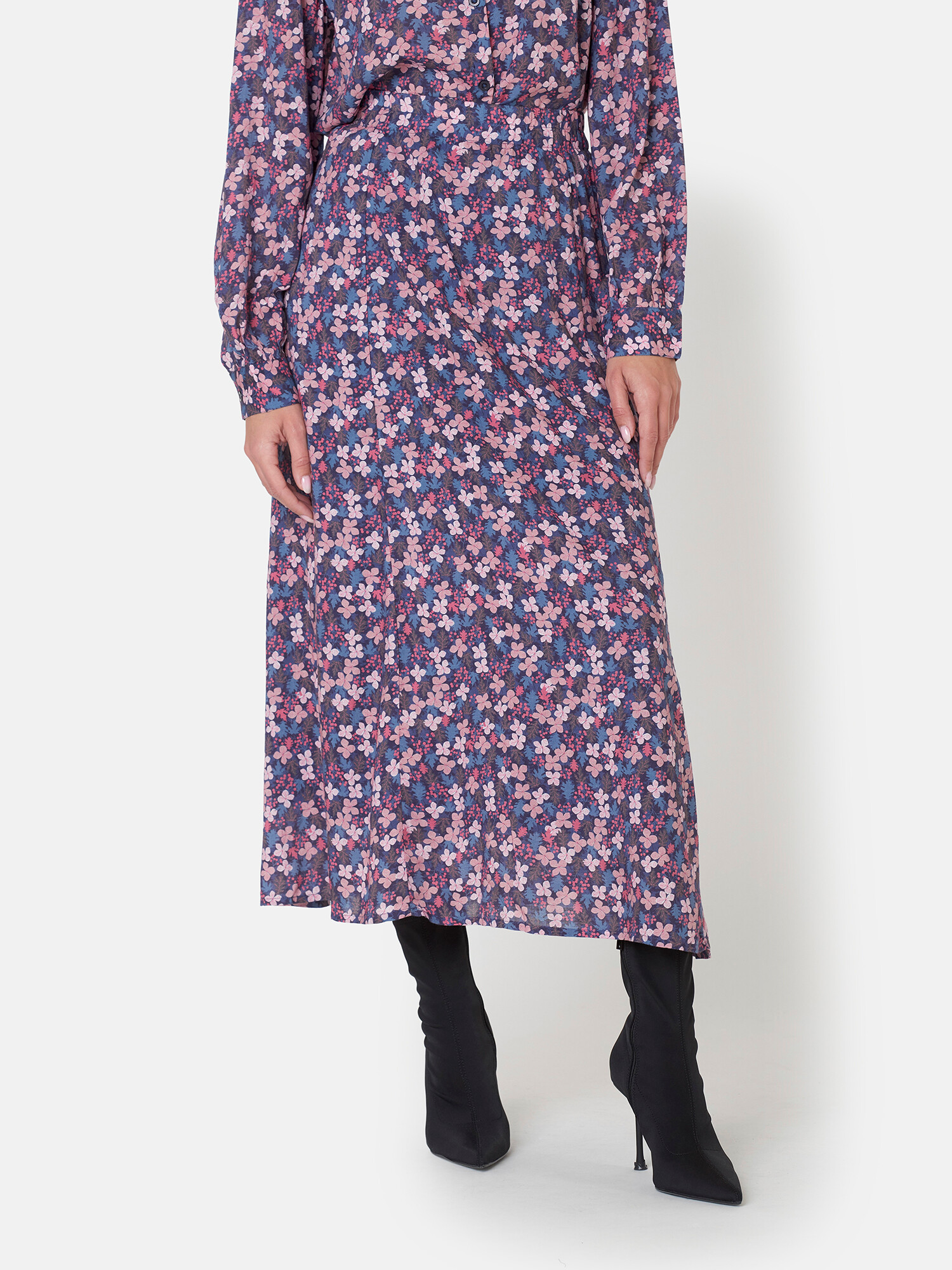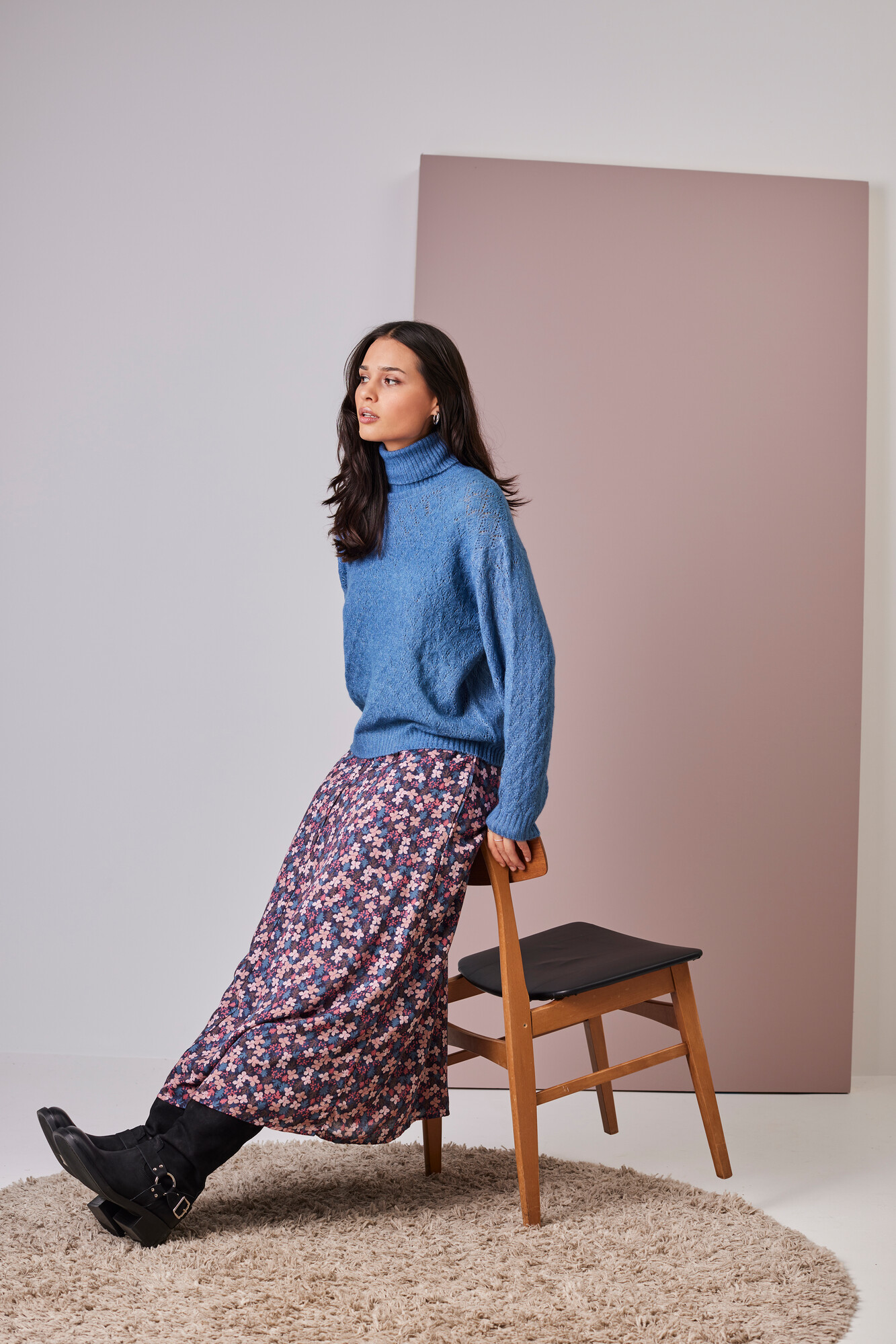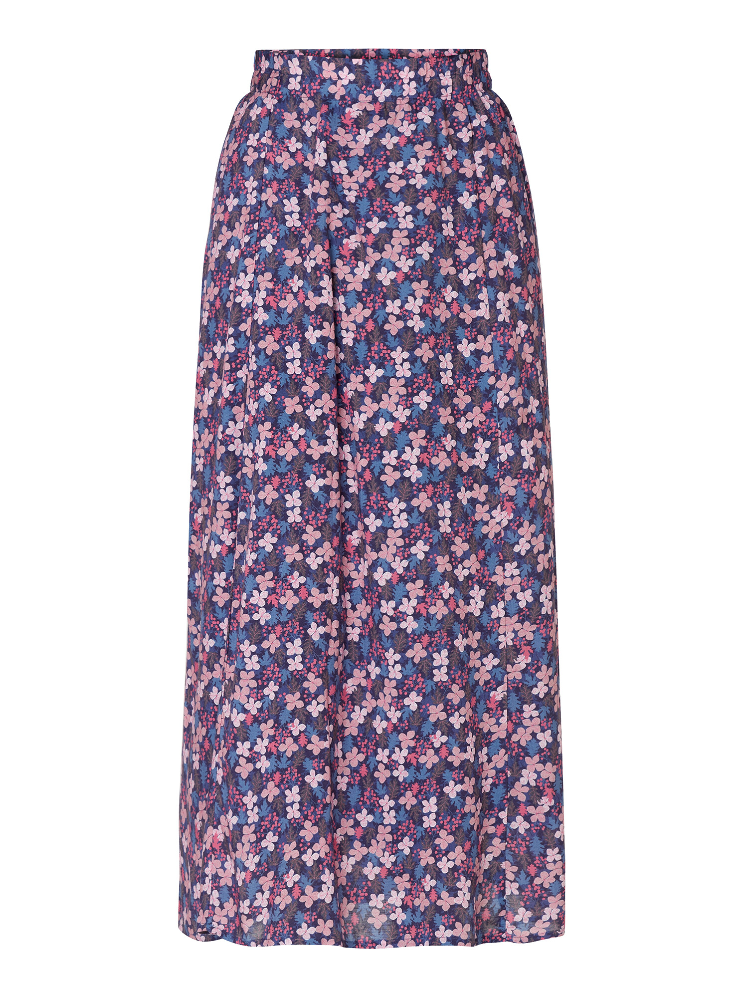 Smart og farverig nederdel i viskose fra Jensen. Denne nederdel er lang og med god vidde. Den har en elastikkant i taljen. En flot og elegant nederdel.