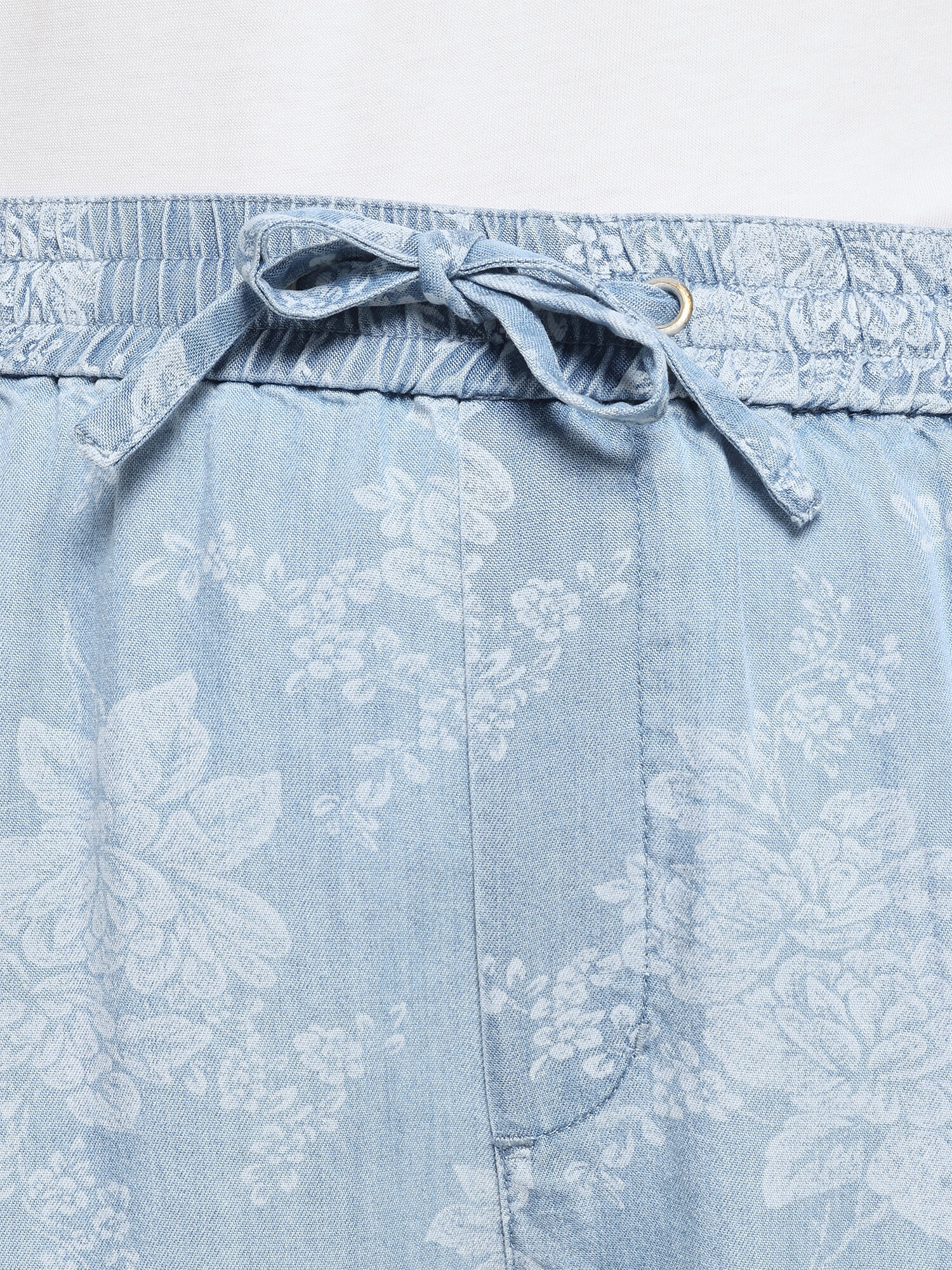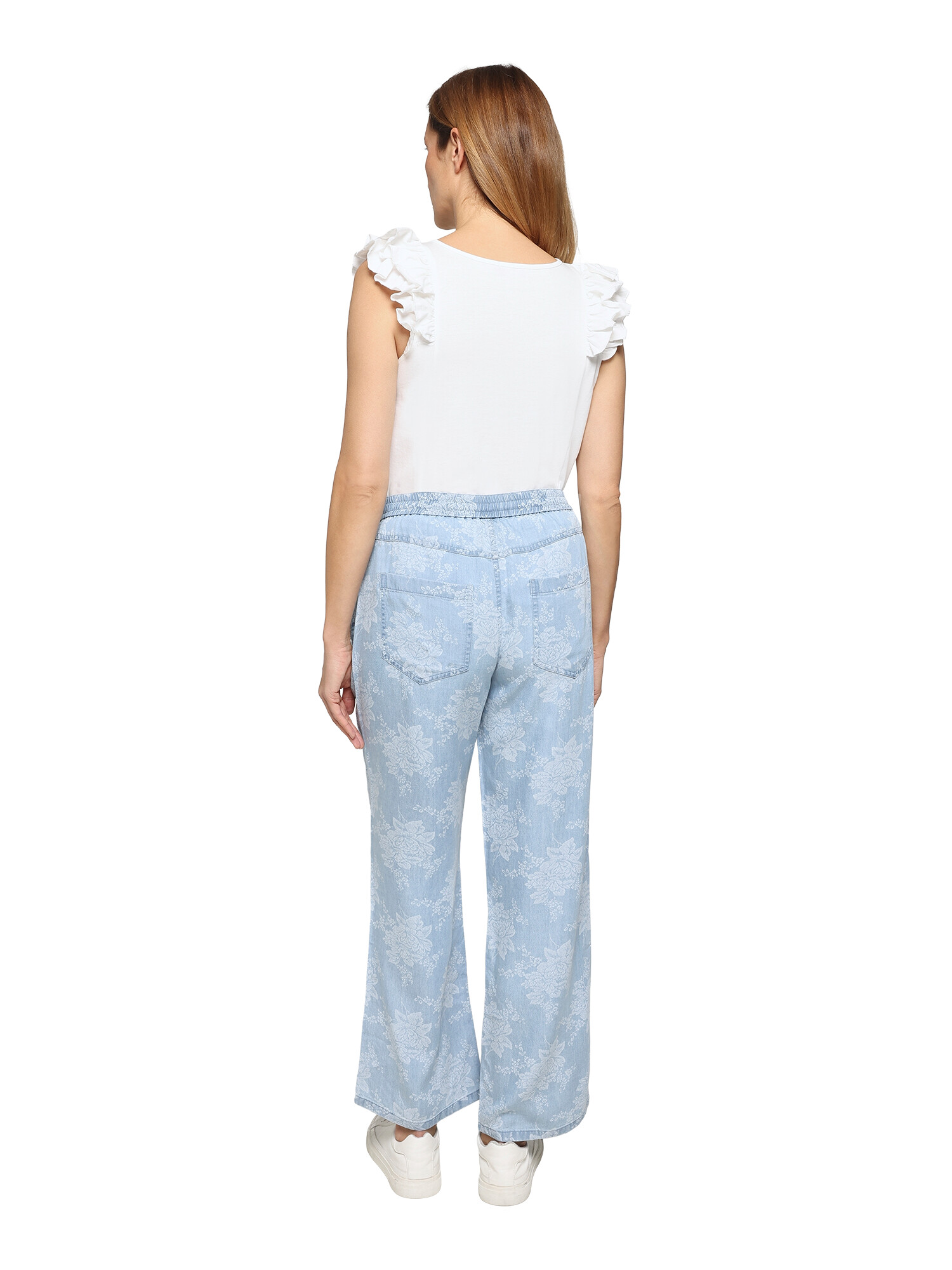 Super flot tynd bomuldsbuks fra Jensen med det fineste blomsterprint. Bukserne har elastik linning og har bindebånd. Der er lommer foran.