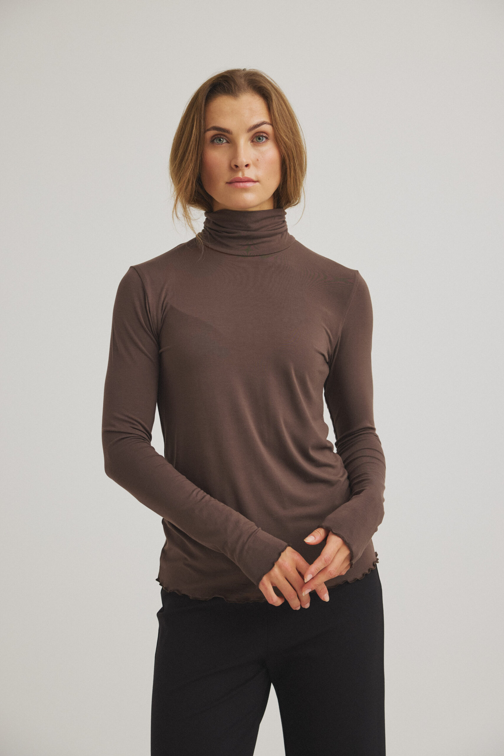 Den bløde bambus kvalitet og let bølgede afslutninger ved ærmer og bund giver et feminint og moderne udtryk.