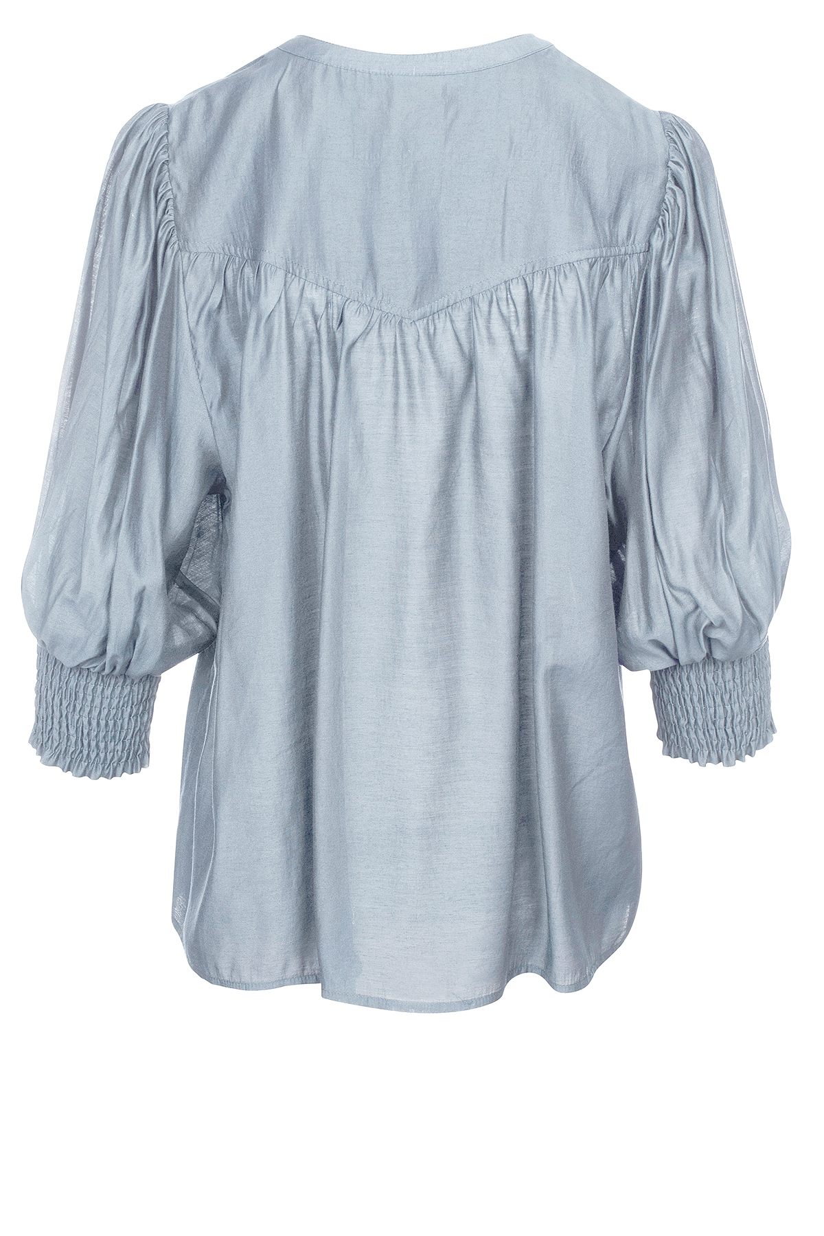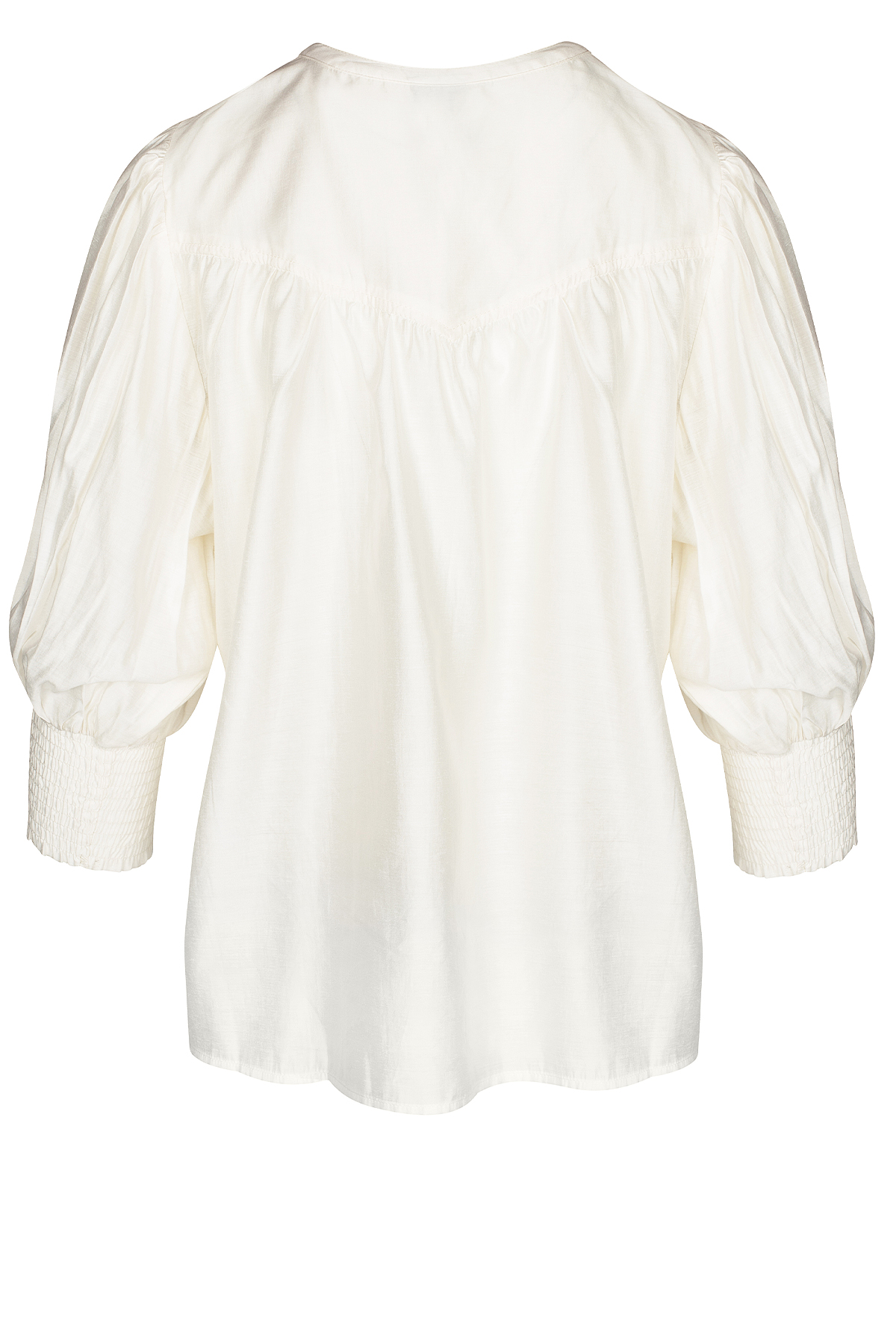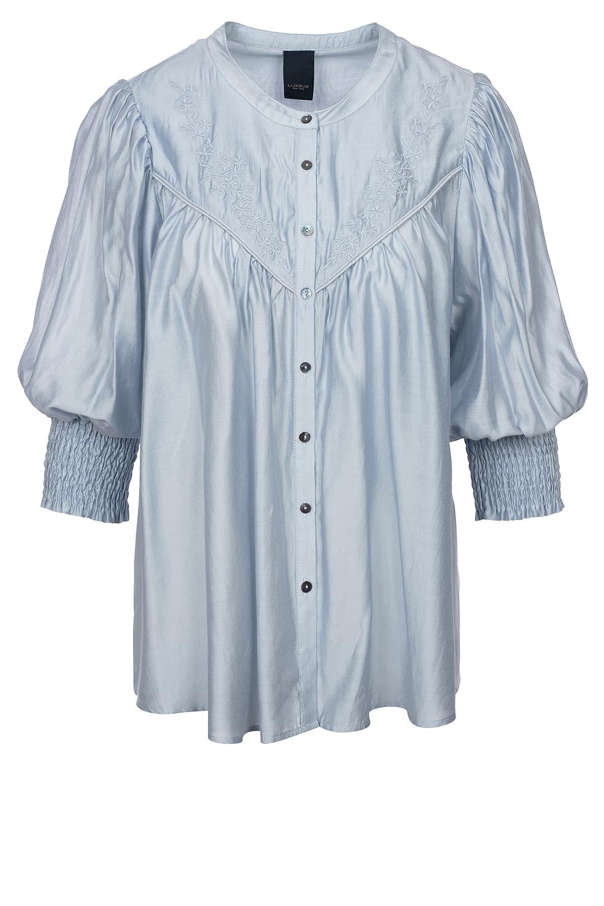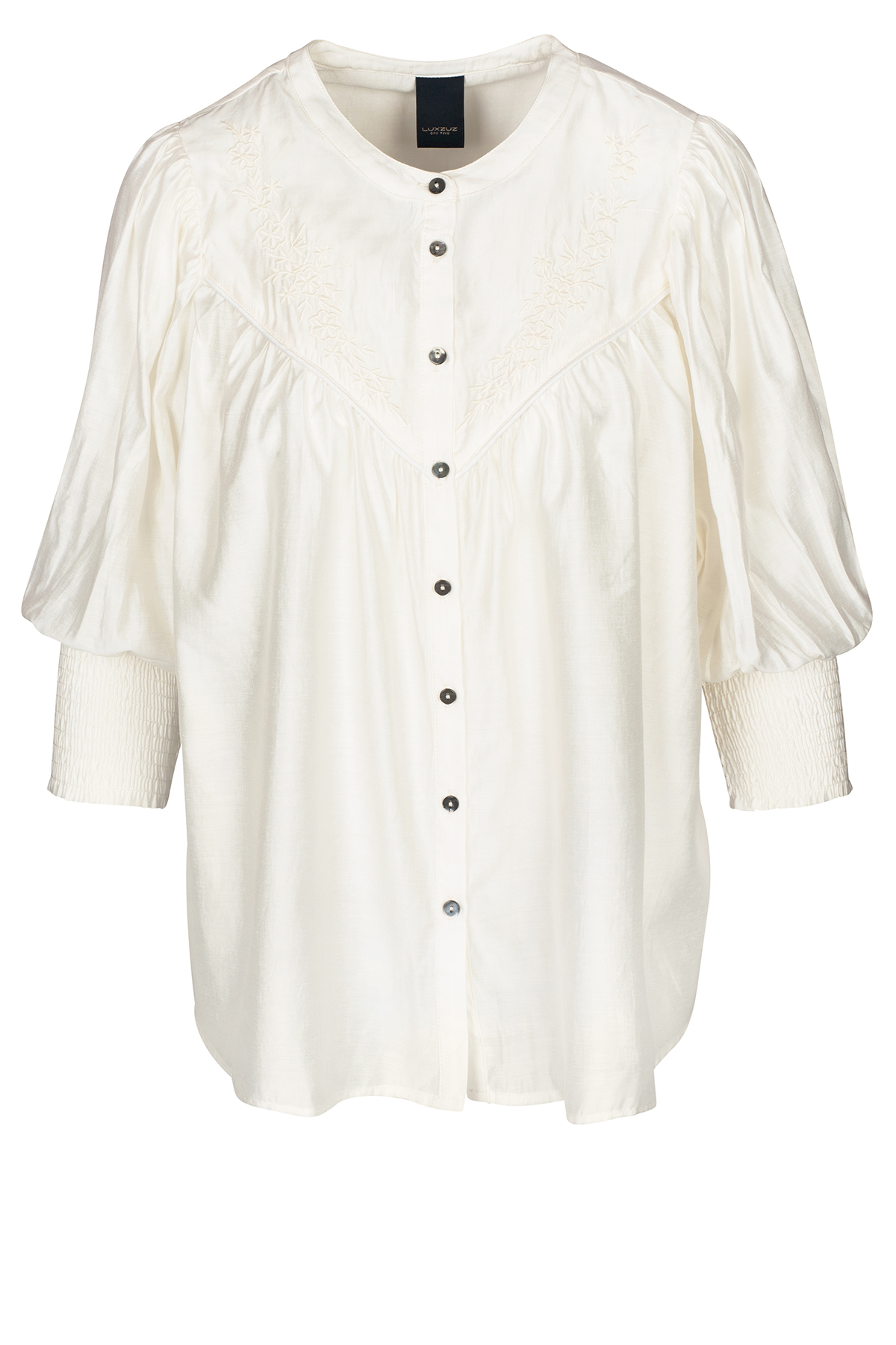 Skjorte fra LUXZUZ // ONE TWO med et feminint og let look med broderi på forsiden, hvilket tilføjer en smuk detalje. Skjorten har knapper foran og 3/4-ærmer, der er afsluttet med en bred smock for en puf-effekt. Skjorten har en løs pasform, der gør den både behagelig og stilfuld.